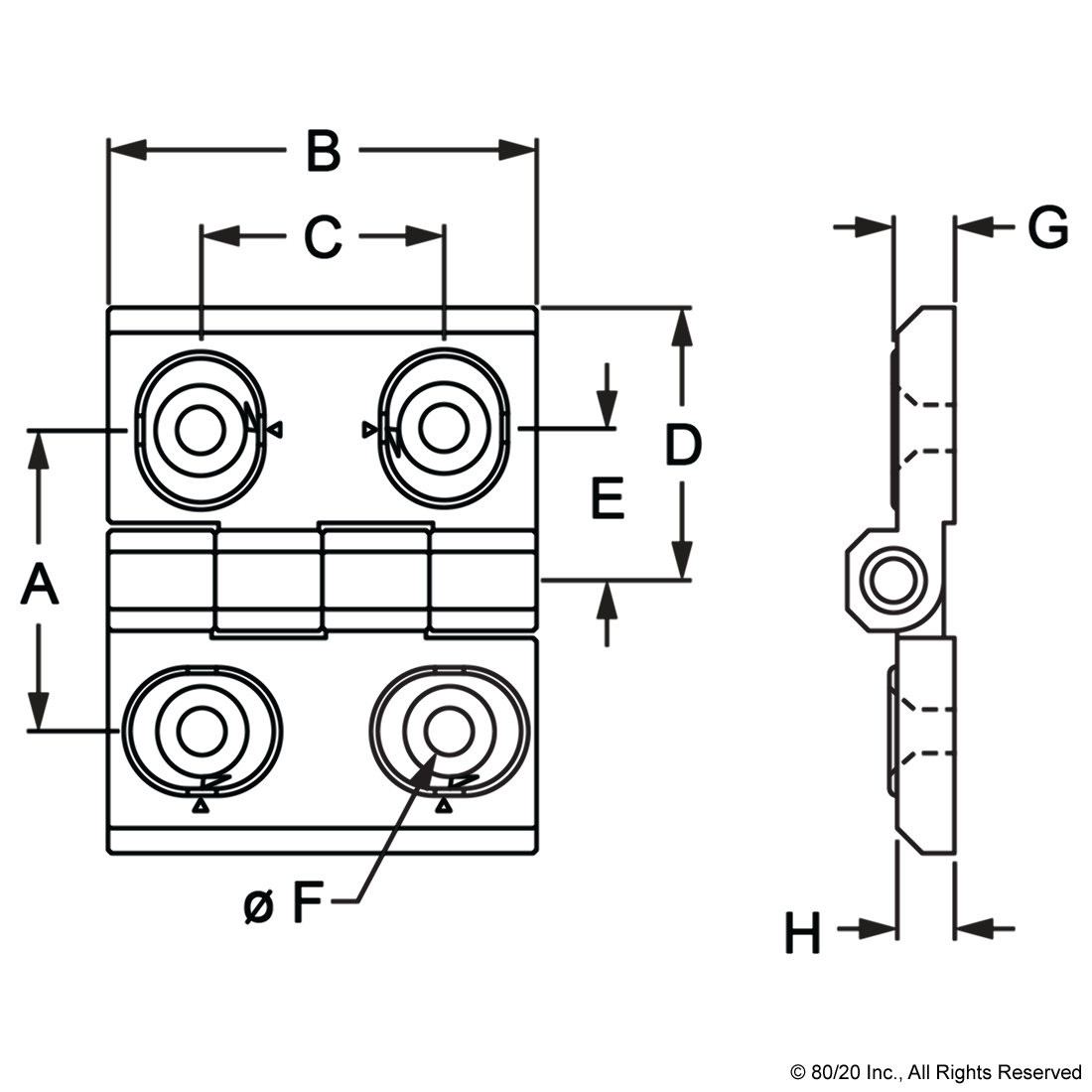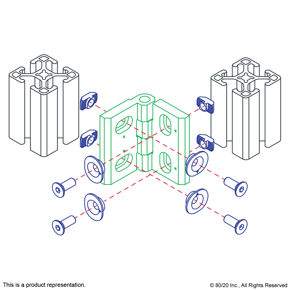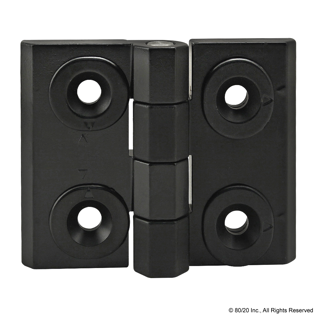 THE 4-HOLE UNIVERSAL ADJUSTABLE HINGE IS DIE CAST ZINC WITH A BLACK POWDER COAT. IT IS COMMONLY USED TO CONNECT T-SLOT PROFILES. AS THE NAME IMPLIES, THE UNIVERSAL HINGE HAS BOTH HORIZONTAL AND VERTICAL SLOTTED HOLES. THE SLOTTED HOLES SUPPORT FASTENING ADJUSTMENTS.,