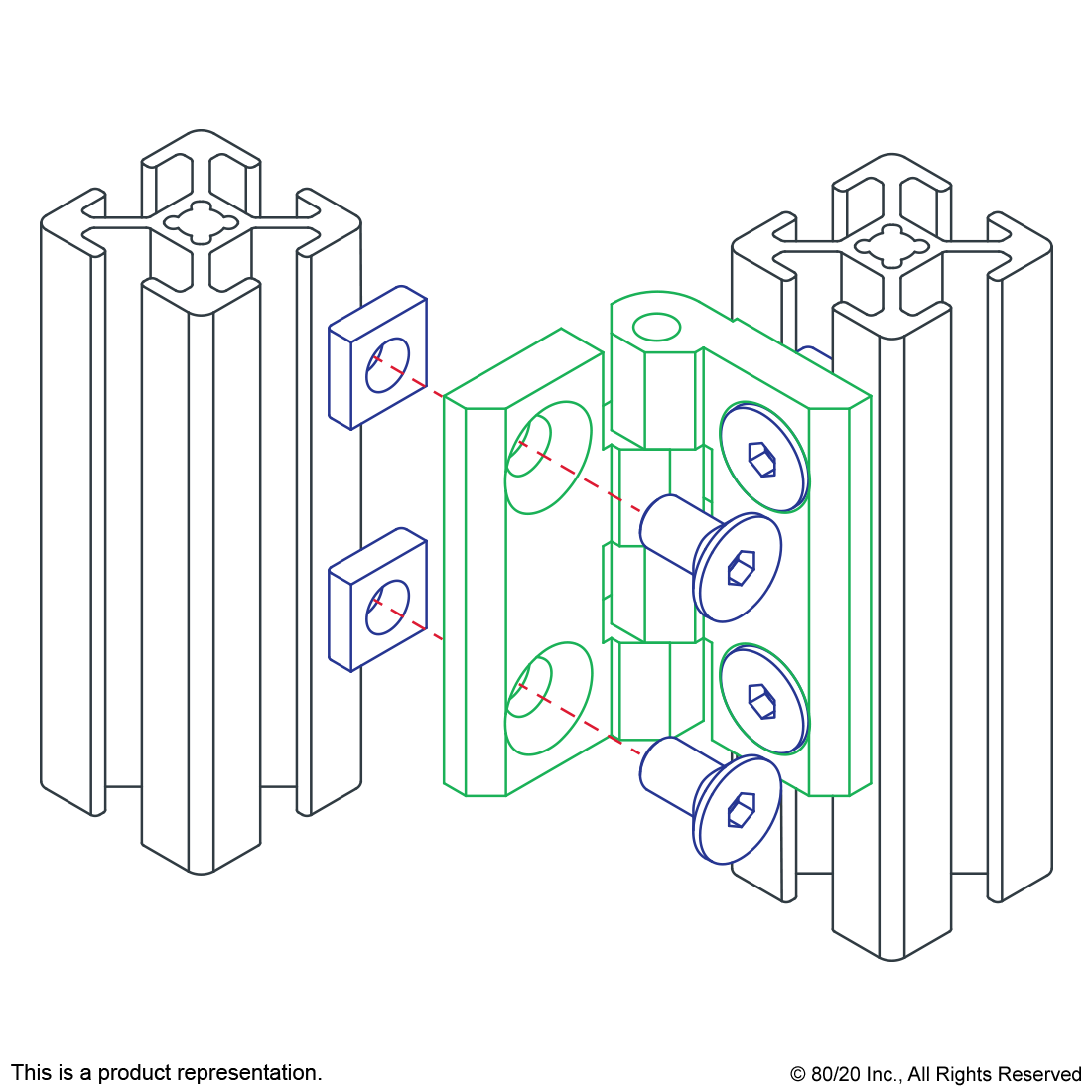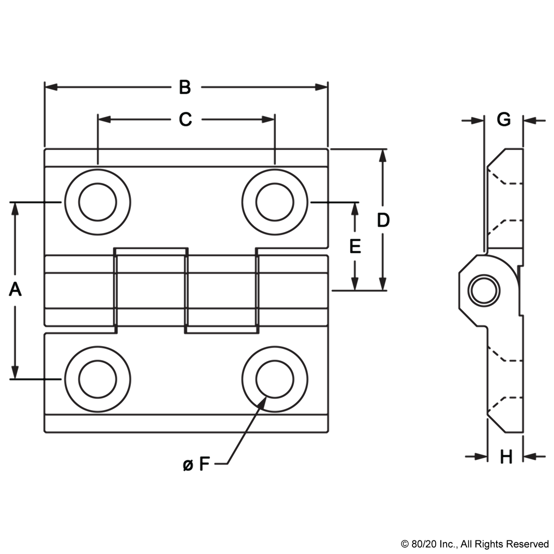 THE 4 HOLE - STANDARD STAINLESS STEEL HINGE IS MADE OF STAINLESS STEEL WITH A PLAIN FINISH. IT IS A HIGHER-STRENGTH HINGE THAT IS COMMONLY USED TO CONNECT DOORS AND PLASTIC PANELS TO T-SLOT PROFILES. THE SUGGESTED HARDWARE TO MOUNT THE HINGE TO A T-SLOT PROFILE CAN BE FOUND ON THE "SUGGESTED HARDWARE" TAB.