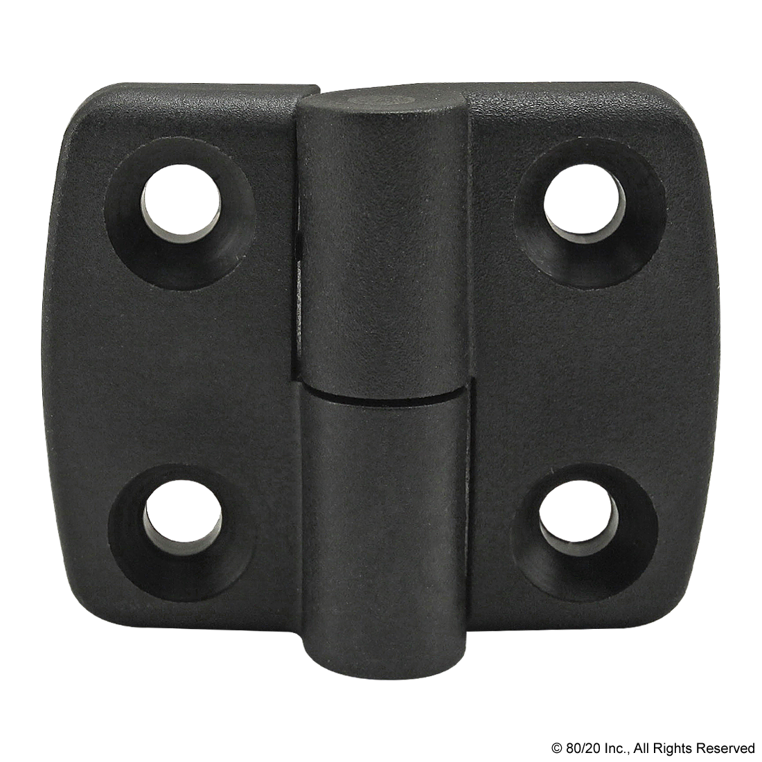 THE 4-HOLE PLASTIC LIFT-OFF HINGE COMES IN BOTH RIGHT AND LEFT HAND OPTIONS AND IS MADE OF FIBERGLASS-REINFORCED BLACK NYLON WITH A STAINLESS STEEL PIN. IT IS COMMONLY USED TO CONNECT PLASTIC PANELS AND LIGHTWEIGHT DOORS TO T-SLOT PROFILES AND IS AVAILABLE IN OPTIONS WITH SLOT TABS TO ASSIST WITH ALIGNMENT. ADDITIONAL INFORMATION: THE GAP DISTANCE BETWEEN PROFILES IS .075" (1.90MM).