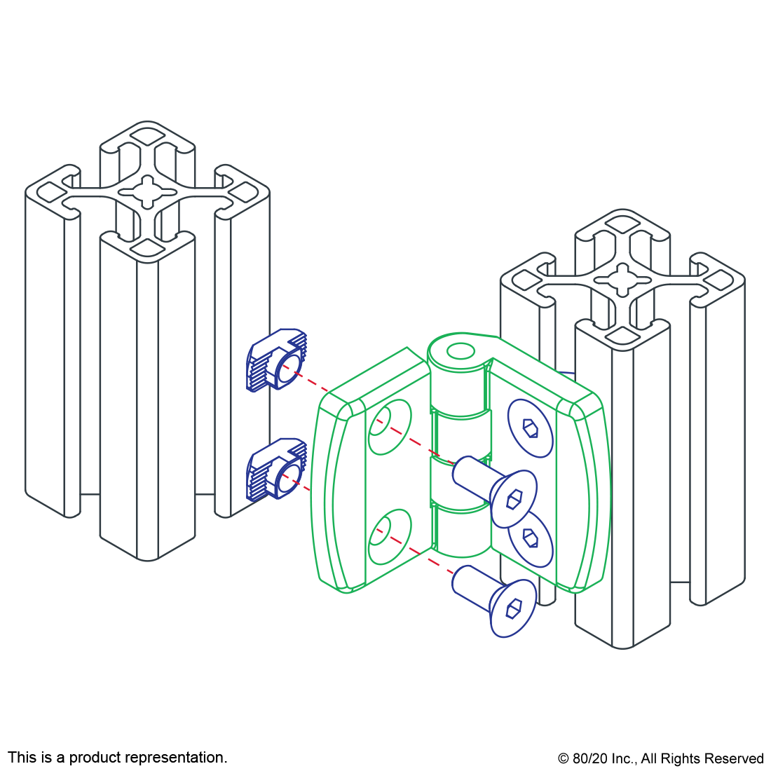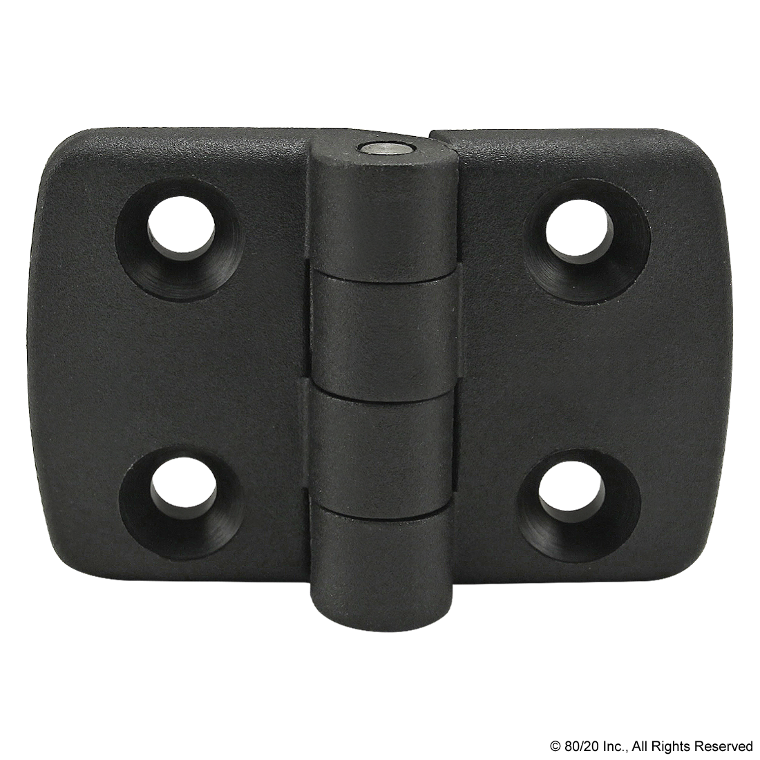 THE 4 HOLE - STANDARD PLASTIC HINGE IS MADE OF FIBERGLASS-REINFORCED BLACK NYLON WITH A STAINLESS STEEL PIN. IT IS COMMONLY USED TO CONNECT PLASTIC PANELS AND LIGHTWEIGHT DOORS TO T-SLOT PROFILES. ADDITIONAL INFORMATION: THE GAP DISTANCE BETWEEN PROFILES IS .075" (1.90MM).