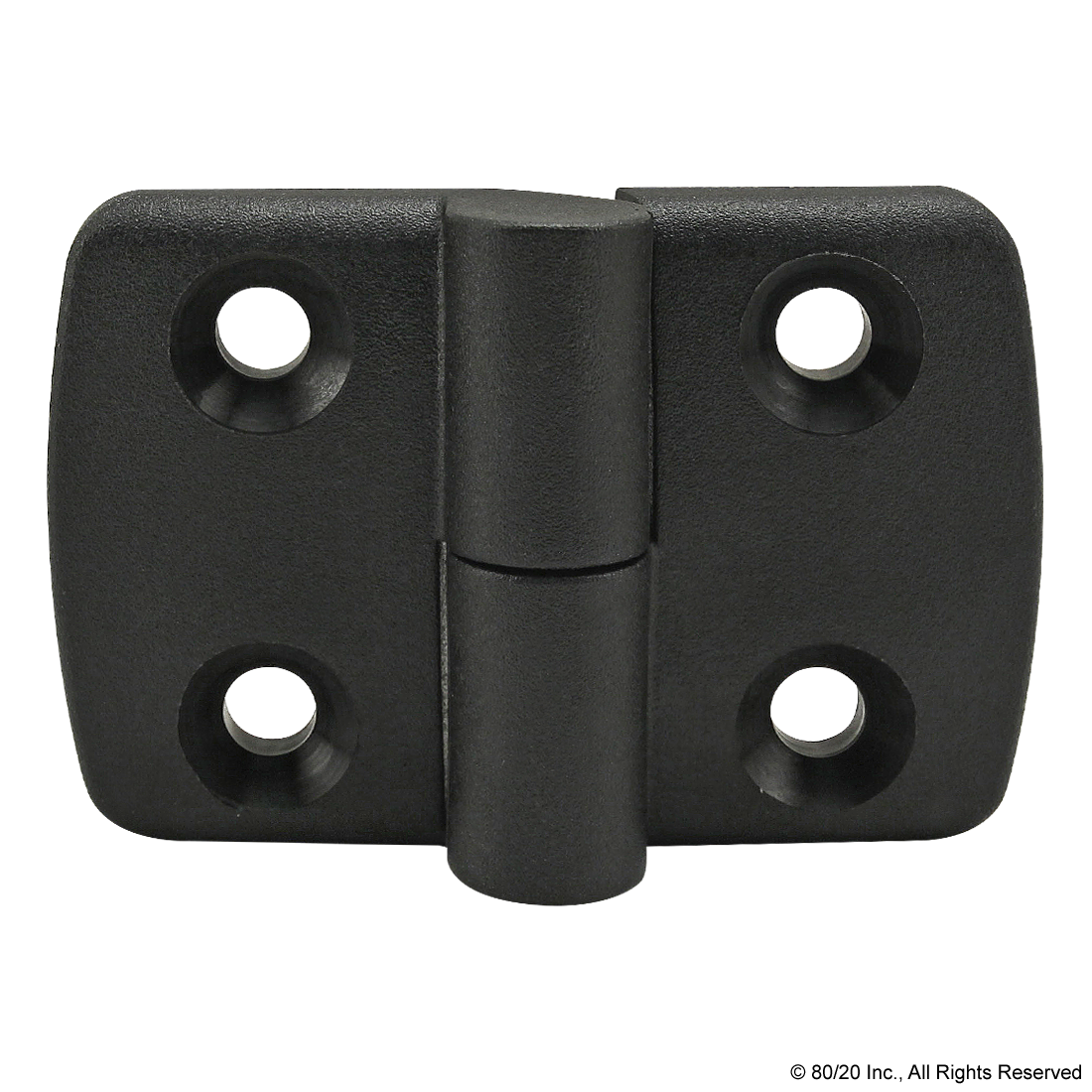 THE 4-HOLE PLASTIC LIFT-OFF HINGE COMES IN BOTH RIGHT AND LEFT HAND OPTIONS AND IS MADE OF FIBERGLASS-REINFORCED BLACK NYLON WITH A STAINLESS STEEL PIN. IT IS COMMONLY USED TO CONNECT PLASTIC PANELS AND LIGHTWEIGHT DOORS TO T-SLOT PROFILES AND IS AVAILABLE IN OPTIONS WITH SLOT TABS TO ASSIST WITH ALIGNMENT. ADDITIONAL INFORMATION: THE GAP DISTANCE BETWEEN PROFILES IS .075" (1.90MM).