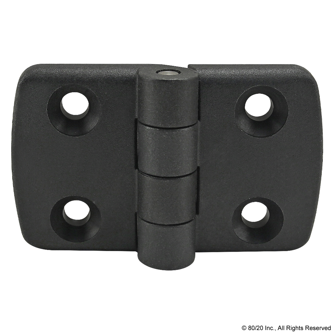 THE 4 HOLE - STANDARD PLASTIC HINGE IS MADE OF FIBERGLASS-REINFORCED BLACK NYLON WITH A STAINLESS STEEL PIN. IT IS COMMONLY USED TO CONNECT PLASTIC PANELS AND LIGHTWEIGHT DOORS TO T-SLOT PROFILES. ADDITIONAL INFORMATION: THE GAP DISTANCE BETWEEN PROFILES IS .075" (1.90MM).