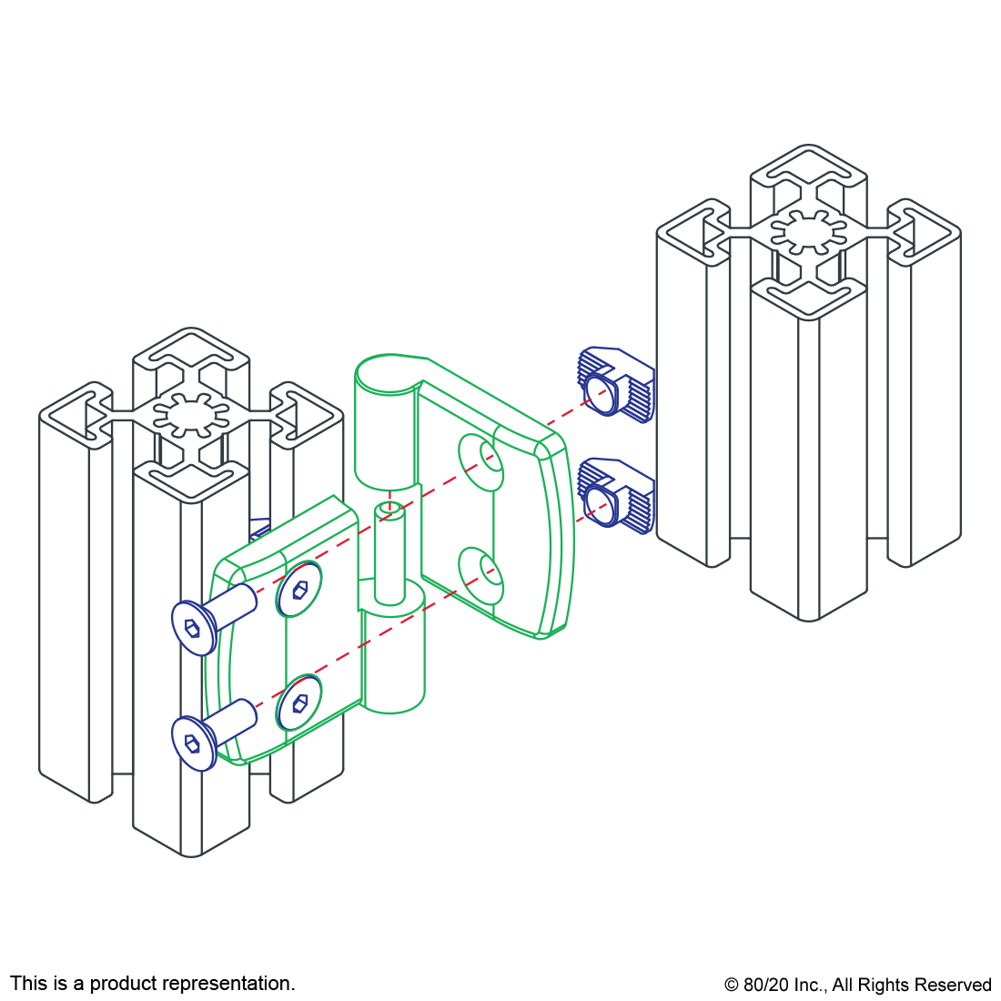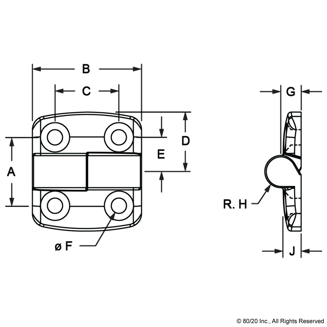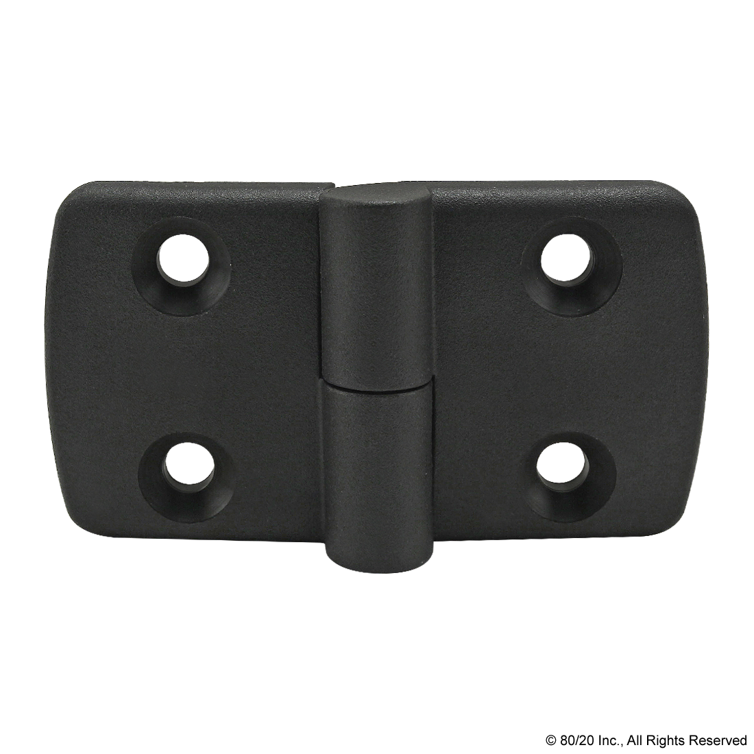 THE 4-HOLE PLASTIC LIFT-OFF HINGE COMES IN BOTH RIGHT AND LEFT HAND OPTIONS AND IS MADE OF FIBERGLASS-REINFORCED BLACK NYLON WITH A STAINLESS STEEL PIN. IT IS COMMONLY USED TO CONNECT PLASTIC PANELS AND LIGHTWEIGHT DOORS TO T-SLOT PROFILES AND IS AVAILABLE IN OPTIONS WITH SLOT TABS TO ASSIST WITH ALIGNMENT. ADDITIONAL INFORMATION: THE GAP DISTANCE BETWEEN PROFILES IS .075" (1.90MM).