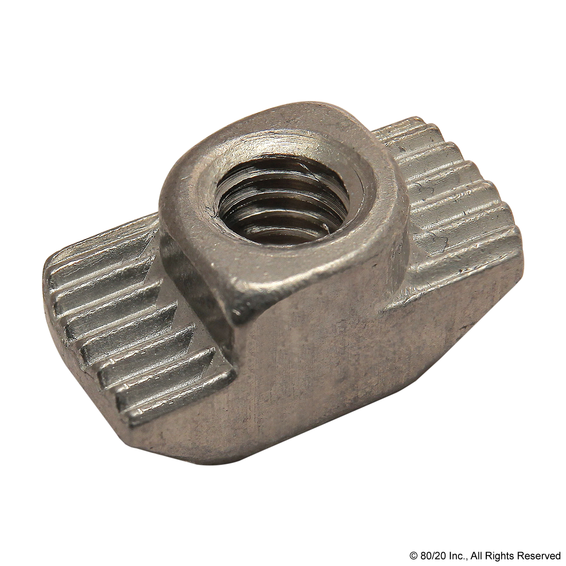 THE STANDARD DROP-IN T-NUT IS A FASTENING OPTION THAT LOADS EITHER FROM THE PROFILE ENDS OR SIDE, WHICH IS HELPFUL FOR APPLICATIONS WHERE THE ENDS ARE INACCESSIBLE. IT HAS RIDGES THAT BITE INTO THE PROFILE SURFACE, CREATING A STRONG CONNECTION. THE STANDARD DROP-IN T-NUT IS AVAILABLE WITH OPTIONS IN SIZE, MATERIAL, THREAD, AND FINISH. ,