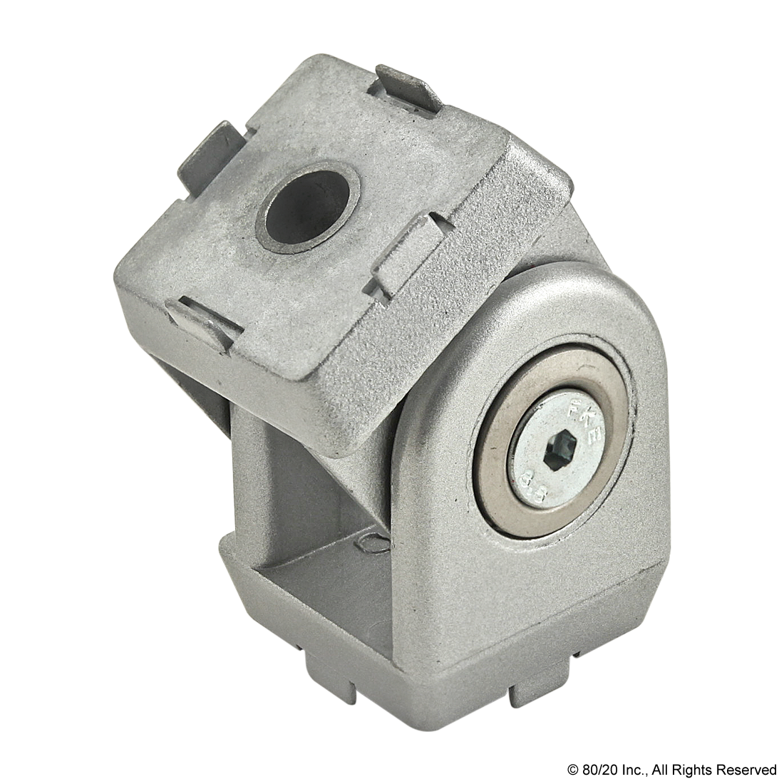 THE 2 HOLE - PIVOT JOINT IS AN EXTERNAL FASTENING METHOD THAT IS LIGHTWEIGHT YET STURDY. THIS CONNECTOR CAN EITHER MOUNT TO THE END OF A PROFILE, WHICH WOULD REQUIRE AND END TAP, OR THE SLOT TABS CAN BE REMOVED FOR MOUNTING DIRECTLY TO THE T-SLOT WITHOUT ANY REQUIRED MACHINING SERVICES. THE SCREWS ON THE ARMS CAN BE ADJUSTED FOR MOVEMENT OR FIXED IN ONE POSITION. THE SUGGESTED HARDWARE FOR THE 2 HOLE - PIVOT JOINT CAN BE FOUND ON THE "SUGGESTED HARDWARE" TAB.