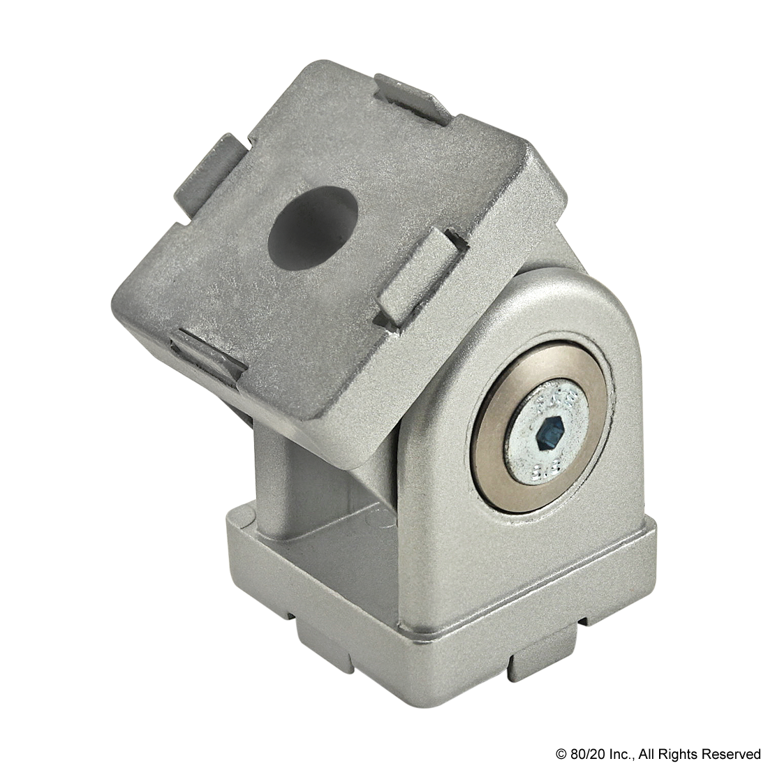 THE 2 HOLE - PIVOT JOINT IS AN EXTERNAL FASTENING METHOD THAT IS LIGHTWEIGHT YET STURDY. THIS CONNECTOR CAN EITHER MOUNT TO THE END OF A PROFILE, WHICH WOULD REQUIRE AND END TAP, OR THE SLOT TABS CAN BE REMOVED FOR MOUNTING DIRECTLY TO THE T-SLOT WITHOUT ANY REQUIRED MACHINING SERVICES. THE SCREWS ON THE ARMS CAN BE ADJUSTED FOR MOVEMENT OR FIXED IN ONE POSITION. THE SUGGESTED HARDWARE FOR THE 2 HOLE - PIVOT JOINT CAN BE FOUND ON THE "SUGGESTED HARDWARE" TAB.