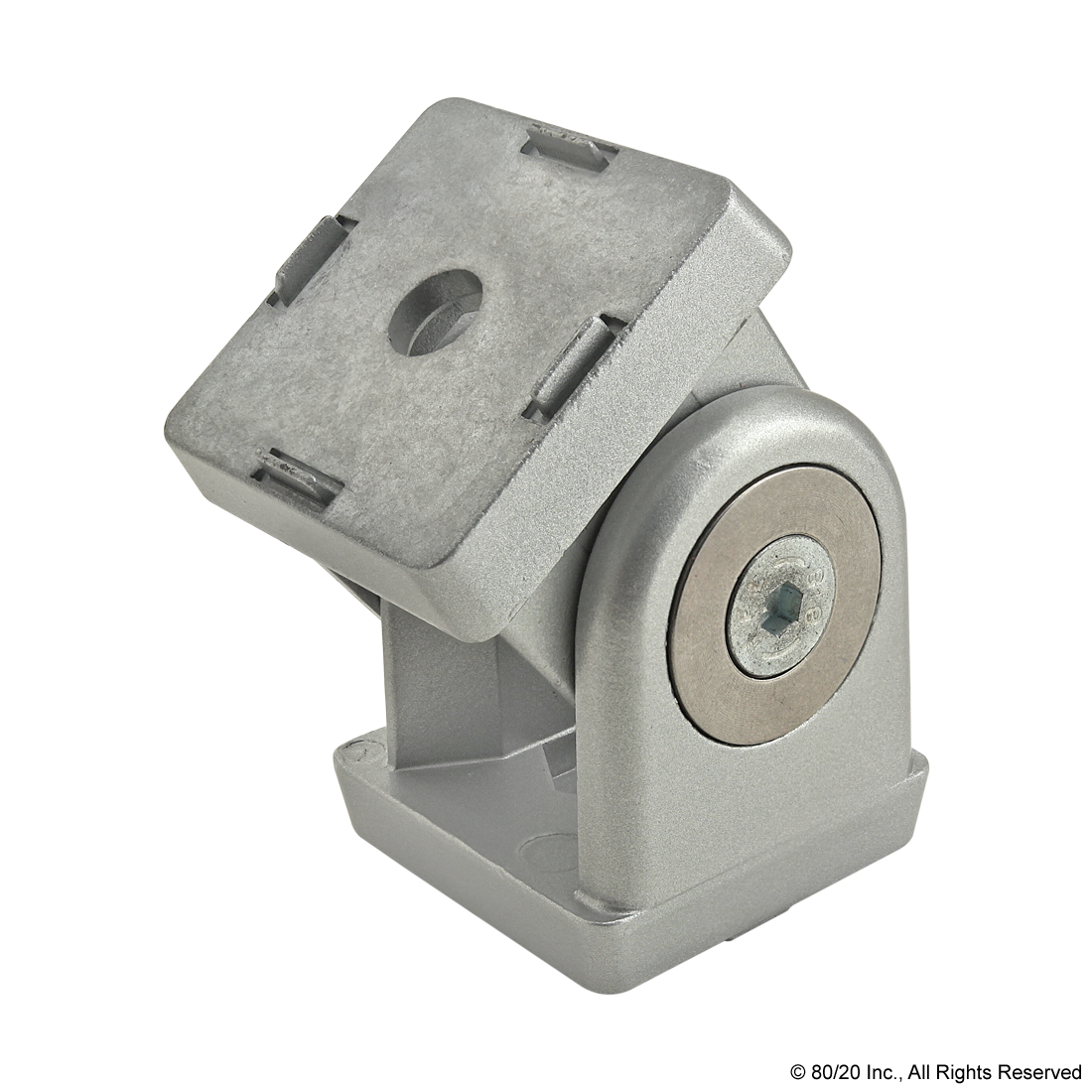 THE 2 HOLE - PIVOT JOINT IS AN EXTERNAL FASTENING METHOD THAT IS LIGHTWEIGHT YET STURDY. THIS CONNECTOR MOUNTS TO THE END OF A PROFILE, WHICH REQUIRES AN END TAP. THE SCREWS ON THE ARMS CAN BE ADJUSTED FOR MOVEMENT OR FIXED IN ONE POSITION. THE SUGGESTED HARDWARE FOR THE 2 HOLE - PIVOT JOINT CAN BE FOUND ON THE "SUGGESTED HARDWARE" TAB.,