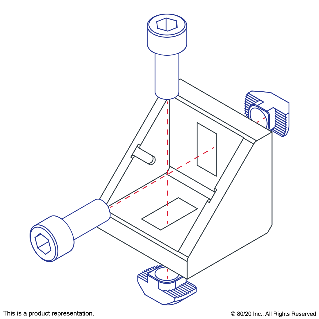THE 2 HOLE- 42MM SLOTTED INSIDE CORNER BRACKET WITH DUAL SUPPORT IS AN EXTERNAL, DIE-CAST FASTENING METHOD THAT CREATES A 90 DEGREE CONNECTION. THE DUAL SUPPORT PROVIDES ADDITIONAL STRENGTH WHILE THE SLOTTED MOUNTING HOLES ALLOW FOR GREATER ADJUSTABILITY BETWEEN THE CONNECTING PROFILES. BRACKETS WITH A SLOT TAB ON THE SUPPORT HELP TO LINE UP THE PROFILE WITH THE BRACKET AND PREVENT ROTATION. THIS FASTENER REQUIRES NO MACHINING SERVICES AND CAN PROVIDE INFINITE POSITIONING ALONG THE PROFILE T-SLOT. THE SUGGESTED MOUNTING HARDWARE CAN BE FOUND ON THE "SUGGESTED HARDWARE" TAB. ,