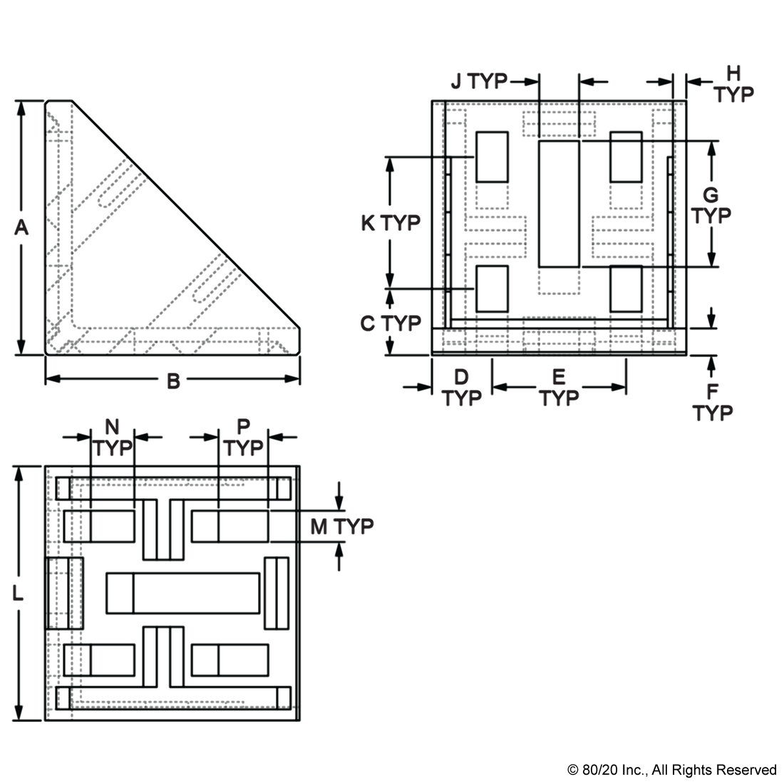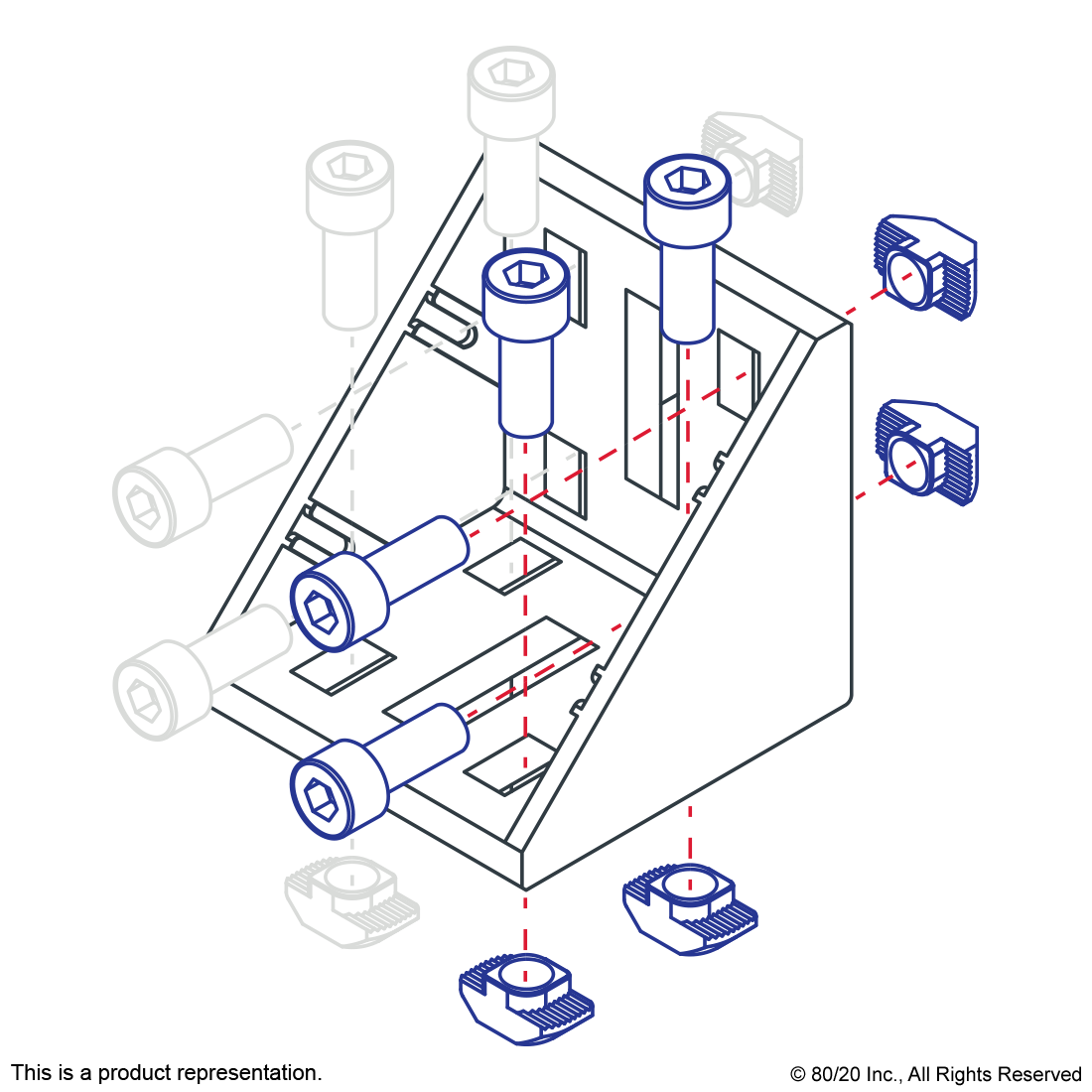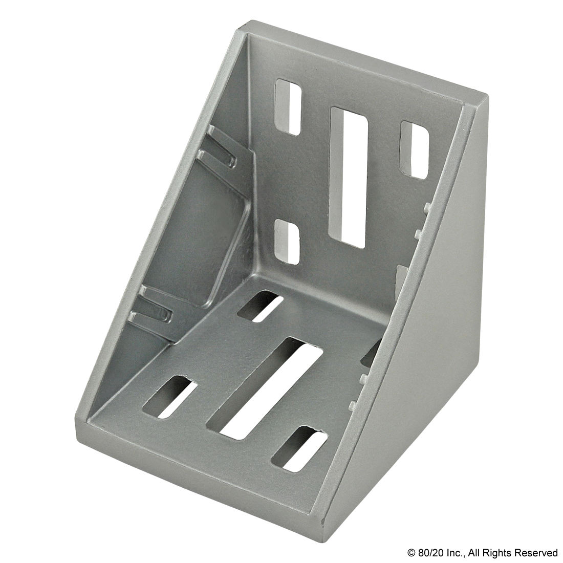 THE 8 HOLE - 57MM INSIDE CORNER BRACKET WITH DUAL SUPPORT IS AN EXTERNAL, DIE-CAST FASTENING METHOD THAT CREATES A 90 DEGREE CONNECTION. THERE ARE FOUR HOLES ON EACH SIDE OF THE BRACKET, COMPRISED OF TWO ROWS AND TWO COLUMNS. THE DUAL SUPPORT PROVIDES ADDITIONAL STRENGTH WHILE THE SLOTTED MOUNTING HOLES ALLOW FOR GREATER ADJUSTABILITY BETWEEN THE CONNECTING PROFILES. BRACKETS WITH A SLOT TAB ON THE SUPPORT HELP TO LINE UP THE PROFILE WITH THE BRACKET AND PREVENT ROTATION. THIS FASTENER REQUIRES NO MACHINING SERVICES AND CAN PROVIDE INFINITE POSITIONING ALONG THE PROFILE T-SLOT. THE SUGGESTED MOUNTING HARDWARE CAN BE FOUND ON THE "SUGGESTED HARDWARE" TAB.