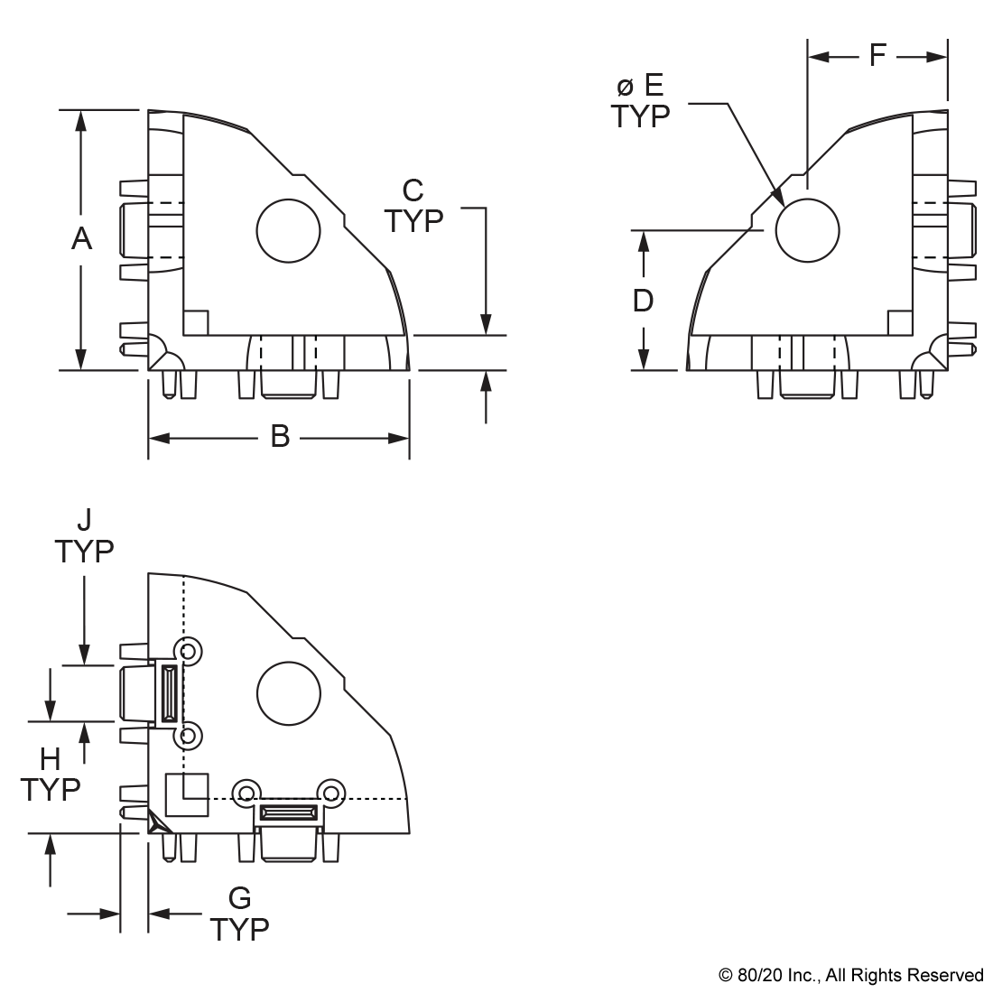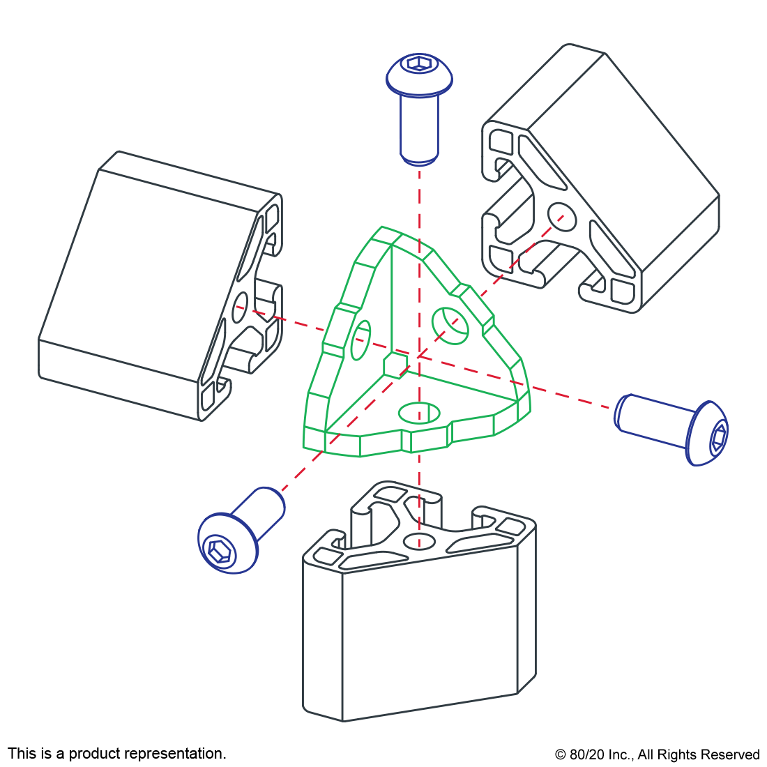 THE 3 WAY - TRIANGULAR CORNER BRACKET IS A DIE-CAST EXTERNAL FASTENING METHOD THAT IS TYPICALLY USED TO CREATE A CORNER CONNECTION BETWEEN THREE PROFILES. IT IS A CONNECTION METHOD THAT IS RECESSED WITHIN THE CORNER AND OFFERS STABILITY. THE SIMPLICITY OF THIS BRACKET MAKES IT EASY TO CONNECT MULTIPLE PROFILES. THE 3 WAY - TRIANGULAR CORNER BRACKET REQUIRES AN END TAP MACHINING SERVICE ON EACH OF THE CONNECTING PROFILES. THE SUGGESTED HARDWARE CAN BE FOUND ON THE "SUGGESTED HARDWARE" TAB.