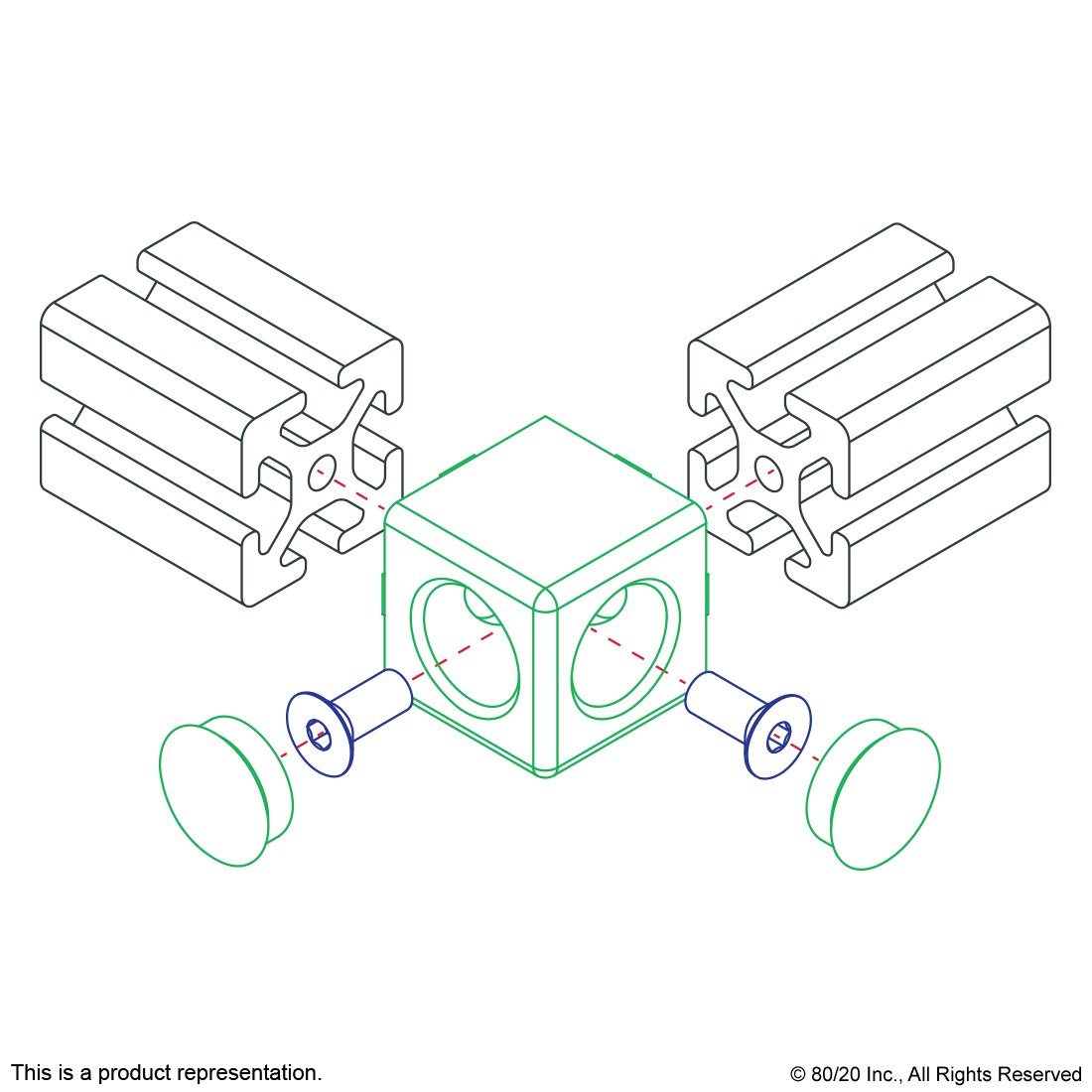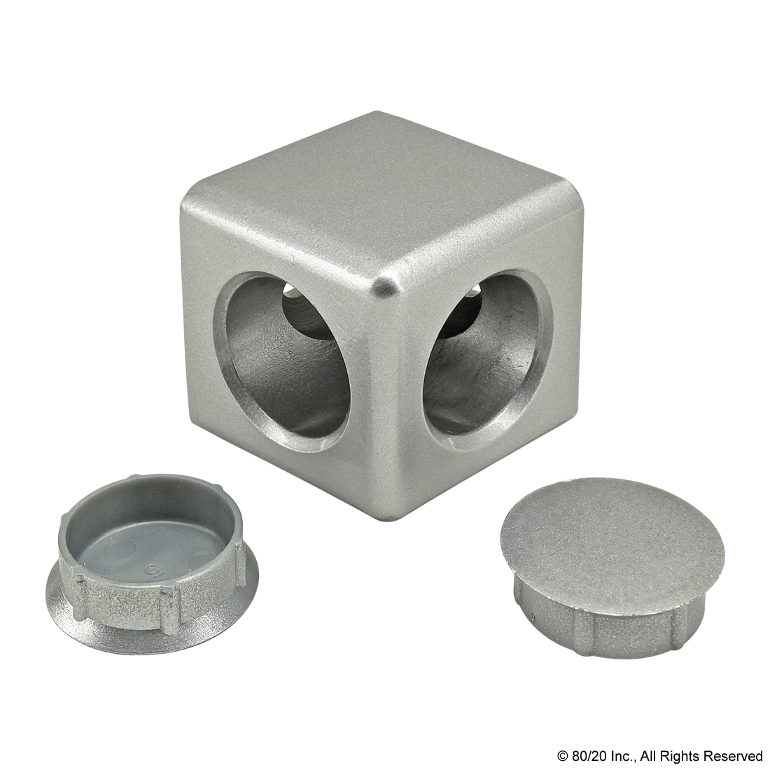 THE 2 WAY - LIGHT SQUARED CORNER CONNECTOR IS A DIE-CAST EXTERNAL FASTENING METHOD THAT IS TYPICALLY USED TO CREATE A SQUARED CORNER CONNECTION BETWEEN TWO PROFILES. THE FASTENER IS LIGHTWEIGHT AND HAS TWO ACCESS HOLES; IT INCLUDES THE COVER CAPS FOR THE HOLES, TO PROVIDE A FINISHED LOOK. THE 2 WAY - LIGHT SQUARED CORNER CONNECTOR REQUIRES AN END TAP MACHINING SERVICE ON THE MATING PROFILES. THE SUGGESTED HARDWARE CAN BE FOUND ON THE "SUGGESTED HARDWARE" TAB. ,