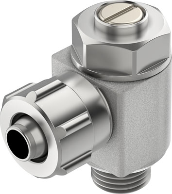 ONE-WAY FLOW CONTROL VALVE GRLZ-1/8-PK-6-B FOR SUPPLY AIR FLOW CONTROL, WITH SWIVEL JOINT. VALVE FUNCTION=ONE-WAY FLOW CONTROL FUNCTION FOR SUPPLY AIR, PNEUMATIC CONNECTION, PORT 1=PK-6 WITH UNION NUT, PNEUMATIC CONNECTION, PORT 2=G1/8, ADJUSTING ELEMENT=SLOTTED HEAD SCREW, MOUNTING TYPE=THREADED