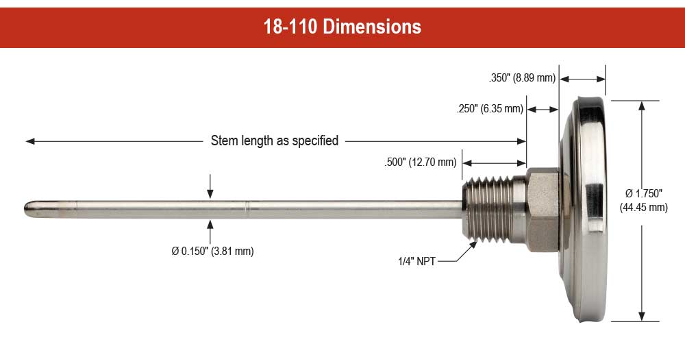 - Accuracy: 1Accuracy Grade: AAccuracy Standard: American Society of Mechanical Engineers (ASME) B40.3Application: Used in almost every area of manufacturing, especially suited for applications in the following areas:Industrial processPetrochemicalFood & beverage processingCommercialWastewaterBimetal Coil: Silicone coated helix coil on ranges below 500 F for vibration dampening, maximum heat transfer and response timeCase Type: Back ConnectionCategory: 100 Series Industrial Type Bimetal ThermometersCertified Calibration: Certified calibration provides the user with a serial numbered thermometer along with a calibration sheet against a primary temperature standardTraceable to the National Institute of Standards and TechnologyConnection Type: National Pipe Thread (NPT)Dial: Anodized Aluminum with large black numbers and graduationsDial Size: 1-3/4Hermetic Seal: Per American Society of Mechanical Engineers (ASME) B40.3 dustproof and leakproofLens/Display Material: Instrument GlassLimits Over Temperature at 100 Percentage: Up to 250Limits Over Temperature at 50 Percentage: 250 to 500Limits Over Temperature at Continuous Use Up to 800 F: 550 to 1,000Limits Over Temperature at Intermittent Use Over 800 F: 550 to 1,000Material: 304 Stainless SteelMounting Flanges - Bimetal Thermometers: Various sizes and types of mounting flanges are availableNote: Thermowells are recommended for pressure, corrosive fluids and high velocity applications.Operating Temperature [Max]: 200Operating Temperature [Min]: 0Optional Case and Bezel Material: 316 Stainless SteelOptional Wetted Parts Material: 316 Stainless SteelOptions and Accessories: 1/8" NPT, Available3/8" NPT, AvailableAcrylic Lens (PL)Polycarbonate Lens (LL)Certificate of ConformanceMounting Brackets - Consult FactoryStainless Steel Tagging (ST)Tempered Glass LensPackage Type: EachPointer: Aluminum, Black FinishedSchemaID: 102551Series: 100Special Dials - Bimetal Thermometers: Special ranges and dials with company names, company logos, part numbers, telephone numbers, or almost any custom layout is availableStem Diameter: 0.150Stem Lengths: 2.5Stem Types: The 304 Series Stainless Steel stem is welded at the tip and case for hermetic seal1/4" (6.35 mm) diameter is standard for lengths up to 24" (609 mm)3/8" diameter, sharp tip options and optional 316SS wetted parts are also availableSyndication_SET: 1Temperature Scale: SingleThermowells: Thermowells allow a temperature instrument to be removed and replaced without shutting down and draining the process, and reduce the possibility of damage to the temperature instrument.Type: Bimetal ThermometerType of Handling Units: 0Type of Packages: 0Unit_SET: 1Wetted Parts Material: 304 Stainless Steel