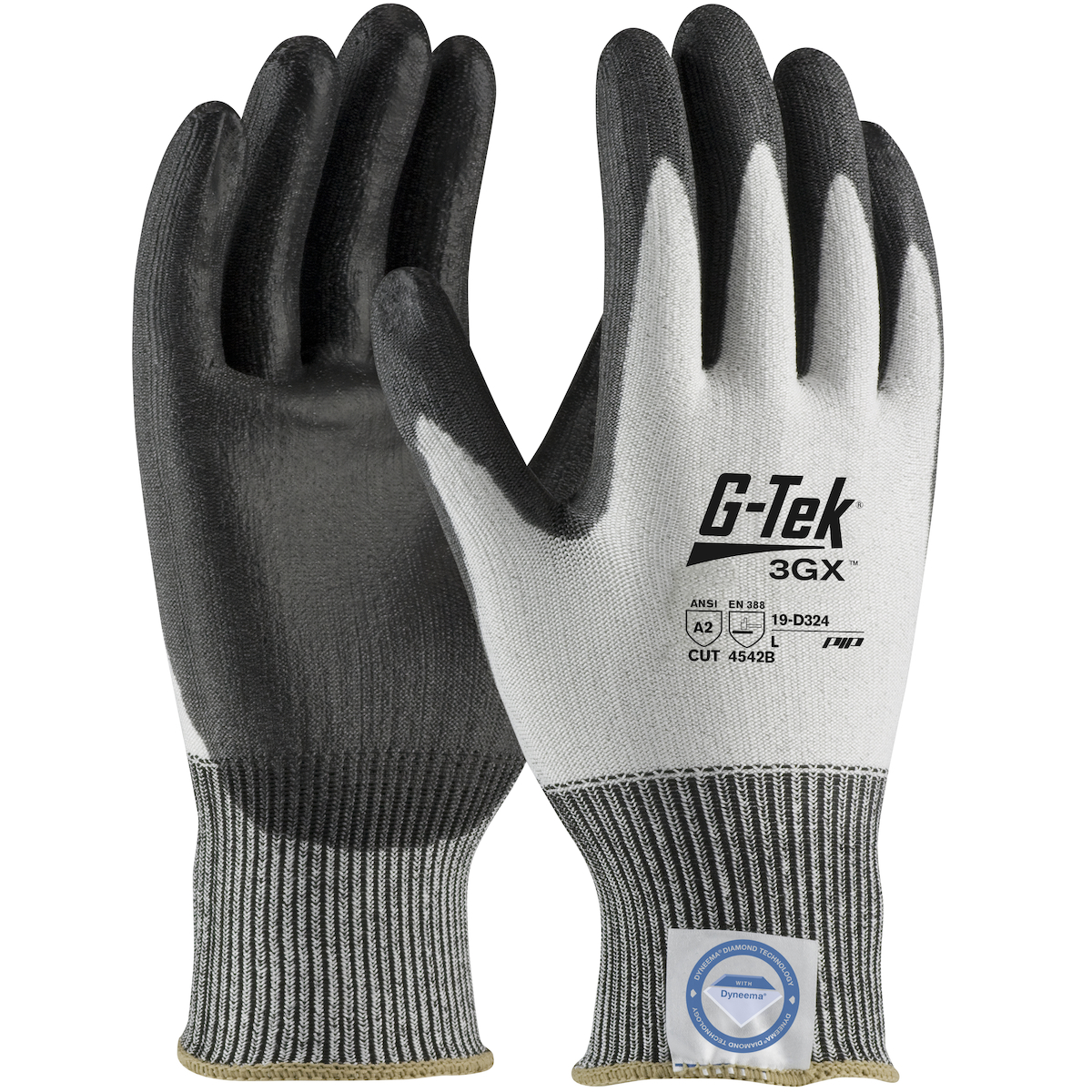 - Ansi abrasion: 3Ansi abrasion cycles: 1800Brand: G-Tek® 3GX®Case qty: 72Case uom: prCategory: Hand ProtectionCoating: PolyurethaneCoating color: BlackCoating coverage: Palm & FingersColor: WhiteConstruction: --Coated Seamless Knit--Cuff: Knit WristEn388: 4542En388 2016: 4542BXEn388 a: 4En388 c: 5En388 i: XEn388 n: BEn388 p: 2En388 t: 4Gauge: 13Grip: FlatGrouping: Cut Resistant GlovesLiner material: --Dyneema Diamond Technology--Prop 65: CancerProp 65 label: https://us.pipglobal.com/images/P65-Warning-Label-Cancer.jpgSegment: Gloves made with DyneemaSize: LSizes: --2XL--L--M--S--XL--XS--Specs: G-Tek 3GX| White Dyneema Diamond| Black Polyurethane Coated Palm| EN Cut Level 5Style: 19-D324