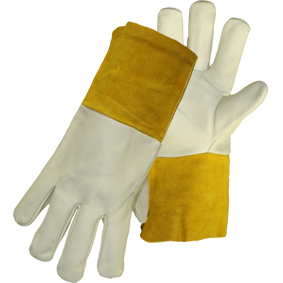 - Brand: Boss®Case qty: 72Case uom: prCategory: Welding ProtectionColor: NaturalFeatures: Grain Cowhide Leather|Gunn Cut Design|Split Cowhide Gauntlet Cuff|Wing Thumb|Leather Grade: StandardGrouping: Hand Protect-WeldingSegment: Welders and Foundry GlovesSize: MSizes: --L--M--XL--Specs: Grain Goatskin Leather|Gunn Cut Design Sewn With Cut & Heat Resistant Aramid ThreadStyle: 1JL0609