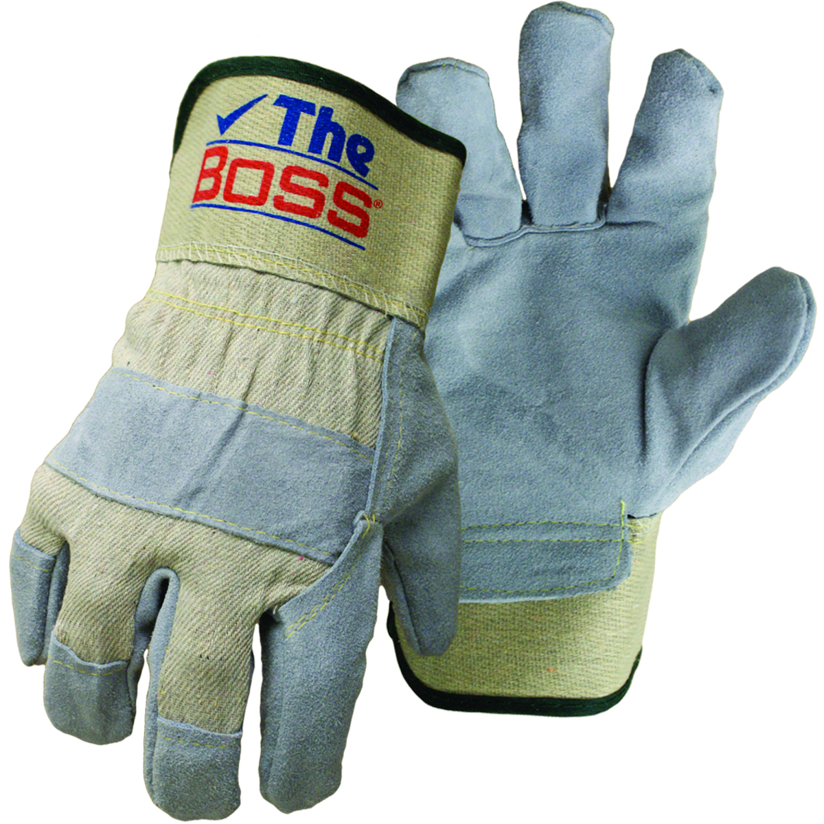 - Back: CanvasBrand: The Boss®Case qty: 72Case uom: prCategory: Hand ProtectionColor: NaturalConstruction: --Cut-and-Sewn--Gunn Cut--Rubberized Cuff--Cuff: SafetyFeatures: Split Cowhide Leather Palm|Cotton Canvas Fabric Back|Rubberized Safety Cuff|Sewn With Heat & Cut Resistant Aramid Thread|Shirred Elastic Back|Wing Thumb|Leather Grade: PremiumGrade: PremiumGrouping: Leather Palm GlovesHide: Split CowhidePalm: SingleSegment: Split Leather PalmSize: XLSizes: --L--S--XL--Specs: Split Cowhide|Premium|White Canvas Back|Wing Thumb| Knuckle Strap|Aramid Stitching|Rubberized Safety CuffStitching: AramidStyle: 1JL5467KThumb: Wing