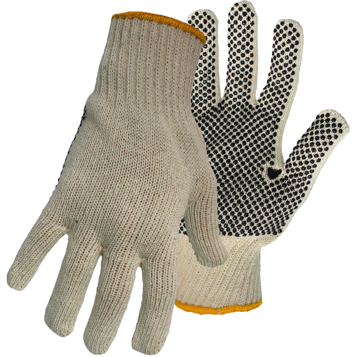 - Brand: Boss®Case qty: 240Case uom: prCategory: Hand ProtectionCoating: PVCCoating color: BlackCoating coverage: One SideColor: NaturalConstruction: --Coated Seamless Knit--Cuff: Knit WristFeatures: Black PVC Dots On Palm|Knit Wrist With Color-Coded Hem|Regular Weight, Natural Cotton/Polyester BlendGrip: DotGrouping: SeamlessGlove CoatedLiner material: --Cotton--Polyester--Prop 65: Cancer and Reproductive HarmProp 65 label: https://us.pipglobal.com/images/P65-Warning-Label-Cancer-and-Reproductive-Harm.jpgSegment: Seamless Knits for General DutySize: LSizes: --L--S--Specs: Cotton/Polyester|Medium Weight|Natural Color|Black PVC Dot Pattern|Single Sided Grip|Knit WristStyle: 1JP5521
