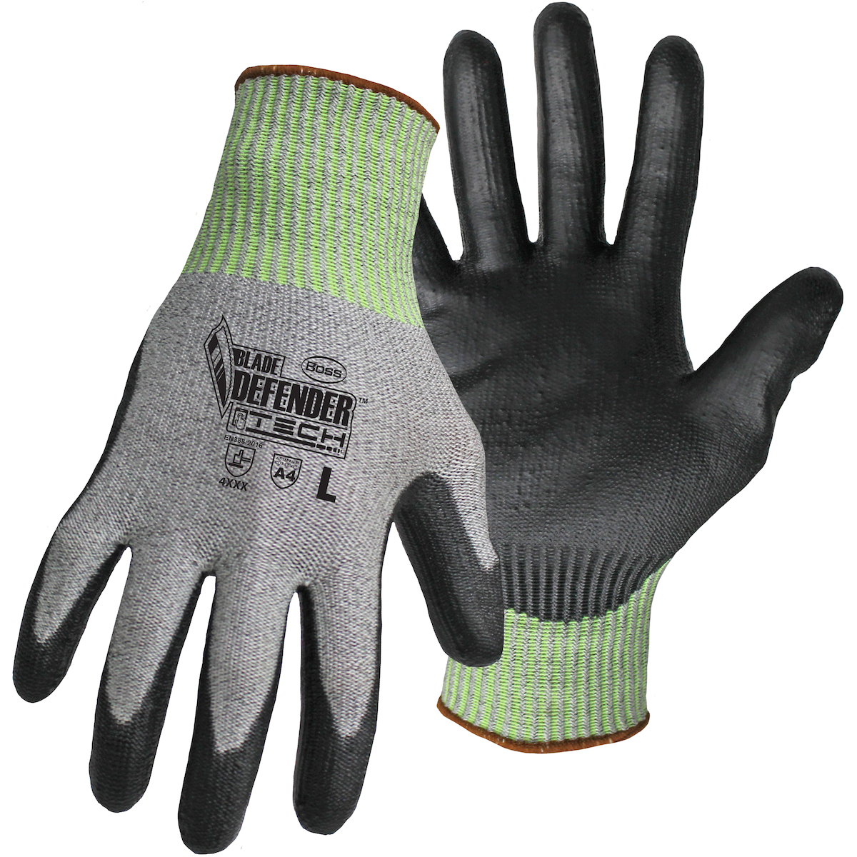 - Brand:Â Blade Defenderâ„¢Case qty:Â 144Case uom:Â prCategory:Â Hand ProtectionCoating:Â PolyurethaneCoating color:Â BlackCoating coverage:Â Palm & FingersColor:Â GrayConstruction:Â --Coated Seamless Knit--Cuff:Â Knit WristEn388:Â 4XEn388 2016:Â 4XEn388 a:Â 4En388 c:Â XFeatures:Â HPPE (Olefin)/Nylon/Glass FIber/Spandex Shell|Touchscreen Fingers|PU Palm Dip|Silicone Free|Knit Wrist With Color-Coded Hem|ANSI Cut Level A4Grip:Â FlatGrouping:Â Cut Resistant GlovesLiner material:Â --HPPE--Nylon--Segment:Â Gloves with PolyKor FiberSilicone free:Â 1Size:Â SSizes:Â --2XL--L--M--S--XL--Specs:Â HPPE Blend Shell| Polyurethane Palm Coating| Touchscreen Fingers|Silicone Free|Vend ReadyStyle:Â 1PU7001