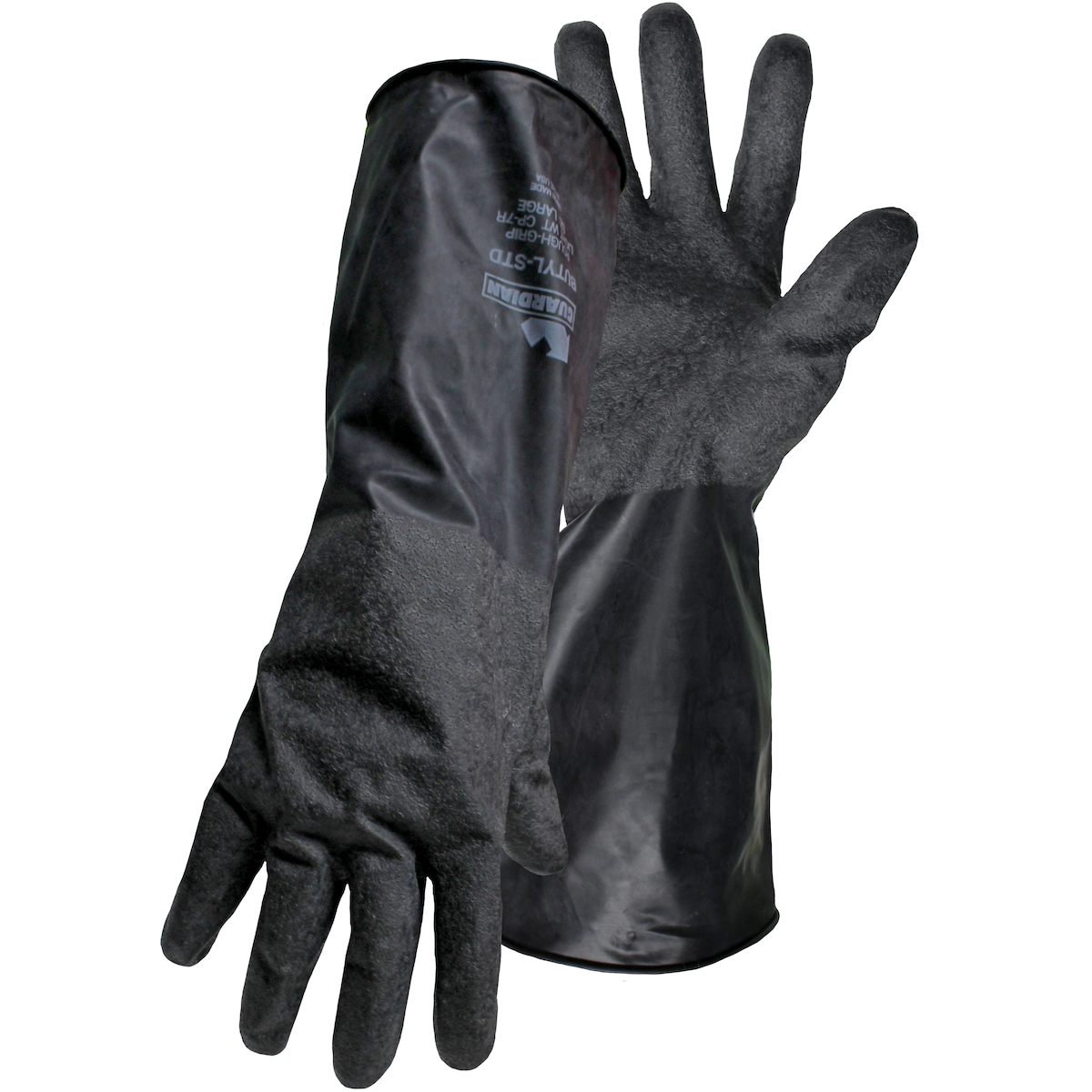 - Brand:Â Guardianâ„¢Case qty:Â 72Case uom:Â prCategory:Â Hand ProtectionCoating color:Â BlackColor:Â BlackFeatures:Â 7 Mil Butyl Rubber|14" Long|Rough-Grip|Ergonomic Hand Design|Easy To Decontaminate|Excellent Holdout|Protects Against Hazardous Chemicals And Materials|Made In The USAGrip:Â RoughGrouping:Â Chemical ResistantLength:Â 14Polymer:Â ButylSegment:Â Unsupported Butyl GlovesSize:Â MSizes:Â --M--S--XL--XS--Specs:Â Guardian Butyl Rubber Glove| 7 Mil| Rough GripStyle:Â 1UB0007RThickness:Â 7