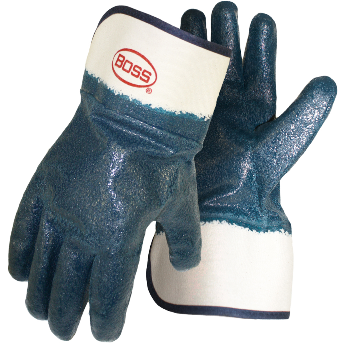 - Brand: Boss®Case qty: 144Case uom: prCategory: Hand ProtectionCoating color: Dark BlueCoating coverage: Full HandColor: NaturalCuff: SafetyFeatures: Fully Coated, Blue Nitrile|Rough Grip|Safety Cuff|2-Piece Jersey LinerGrip: TexturedGrouping: SeamlessGlove CoatedSegment: Coated Supported GlovesSize: LSizes: --L--XL--Specs: Jersey Liner|Full Dip Blue Nitrile Coating|Rough Finish| Safety CuffStyle: 1UH7365