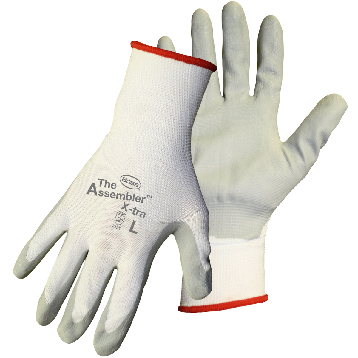 - Brand: The Assembler™Case qty: 144Case uom: prCategory: Hand ProtectionCoating: NitrileCoating color: GrayCoating coverage: Palm & FingersColor: WhiteConstruction: --Coated Seamless Knit--Cuff: Knit WristFeatures: Breathable Back|Knit Wrist With Color-Coded Hem|Palm Dip Of Absorbent Open-Cell Foam Nitrile|13 Gauge Seamless Polyester Shell|EN 388: 2121 (Cut Level 1)Gauge: 13Grip: FoamGrouping: SeamlessGlove CoatedLiner material: --Polyester--Segment: Seamless Knits for General DutySize: LSizes: --2XL--L--S--XL--Specs: BOSS® THE ASSEMBLER™ X-TRA PALM DIPPED WITH COLOR CODED HEMStyle: 1UH7805