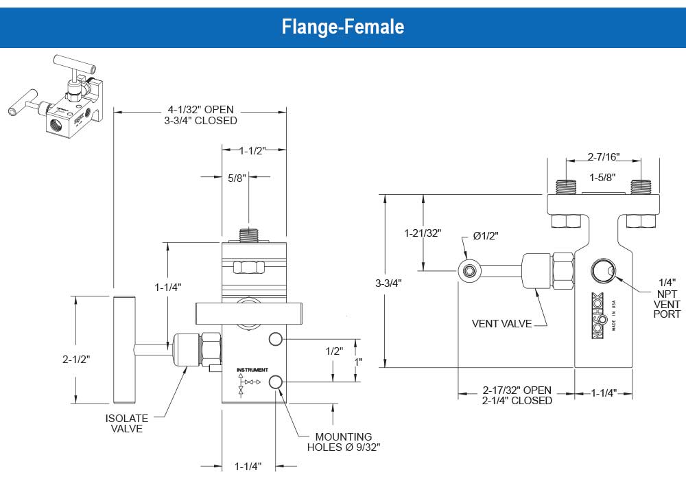 - Block valve is located on the left side and the bleed valve is located on top in a 90ยบ orientation, venting is to the right