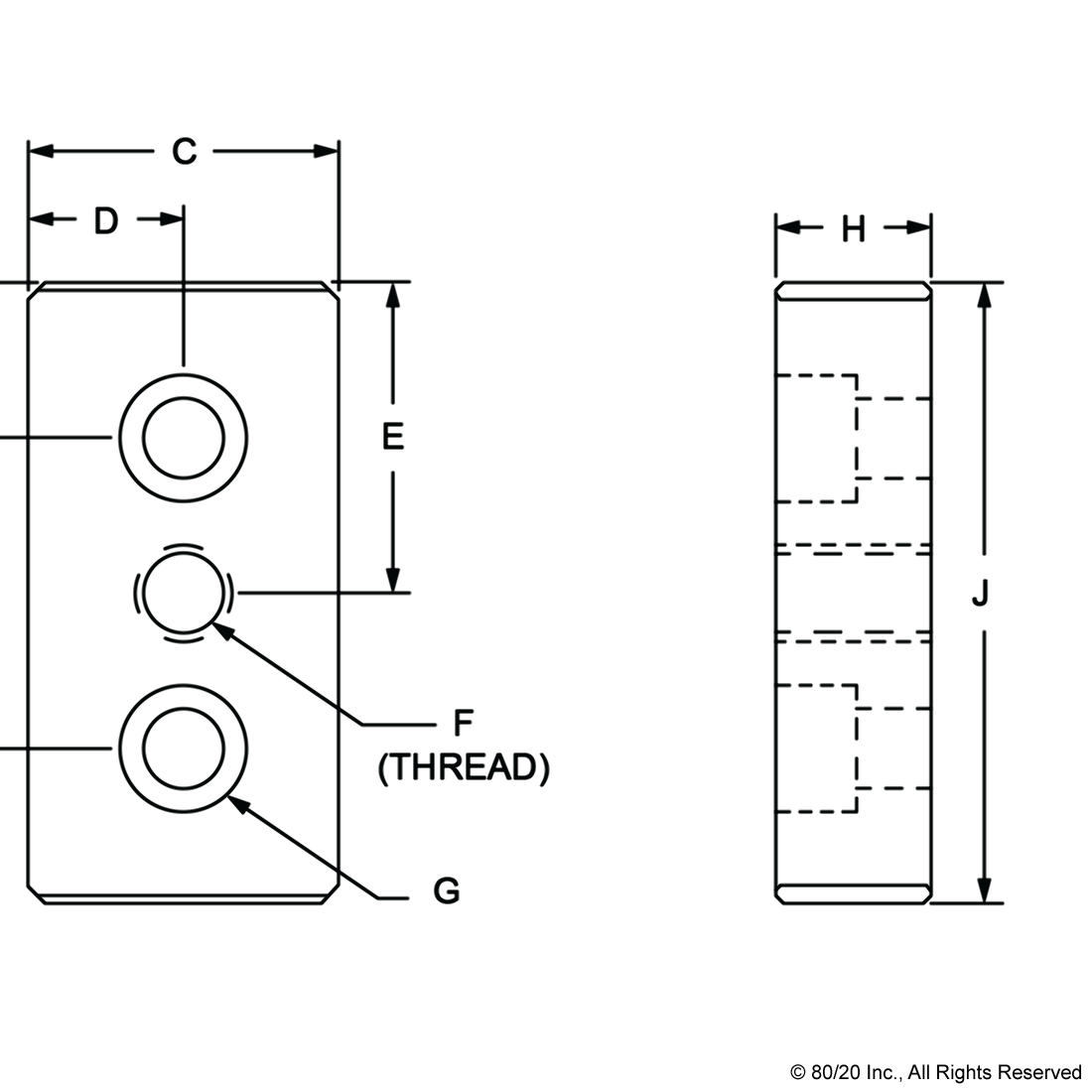 THE 3 HOLE - CENTER TAP BASE PLATE IS MADE OF ANODIZED ALUMINUM TO WITHSTAND DAILY USE AND WEAR AND TEAR. IT MOUNTS LEVELING FEET AND THREADED STEM CASTERS, AND IS COMMONLY USED ON A RECTANGULAR PROFILE END TO CENTER MOUNT THE FOOT OR CASTER. THE 3 HOLE - CENTER TAP BASE PLATE CAN ALSO BE USED ON A PROFILE SIDE. IT REQUIRES A TAP TO MOUNT TO A PROFILE END.,