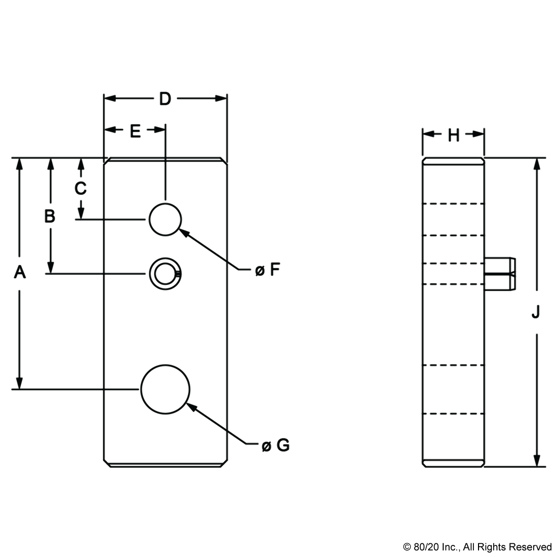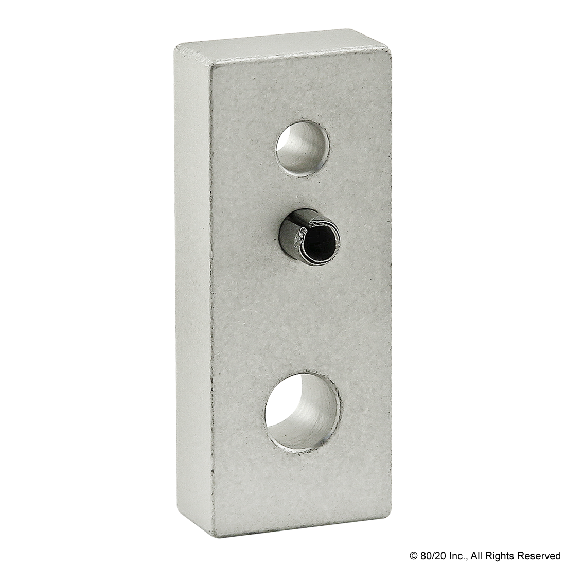 THE 2 HOLE - LEVELING ANCHORING BASE PLATE IS MADE OF ANODIZED ALUMINUM TO WITHSTAND DAILY USE AND WEAR AND TEAR. IT MOUNTS TO A PROFILE END AND PROVIDES AN OFFSET HOLE THAT ALLOWS A LEVELING FOOT AND FLOOR ANCHOR TO BE USED AT THE SAME TIME. THE EXTENSION PIN HELPS ALIGN THE BASE PLATE WITHIN THE T-SLOT TO KEEP THE PROFILE FROM ROTATING. A TAP IS REQUIRED TO MOUNT TO THE PROFILE END.