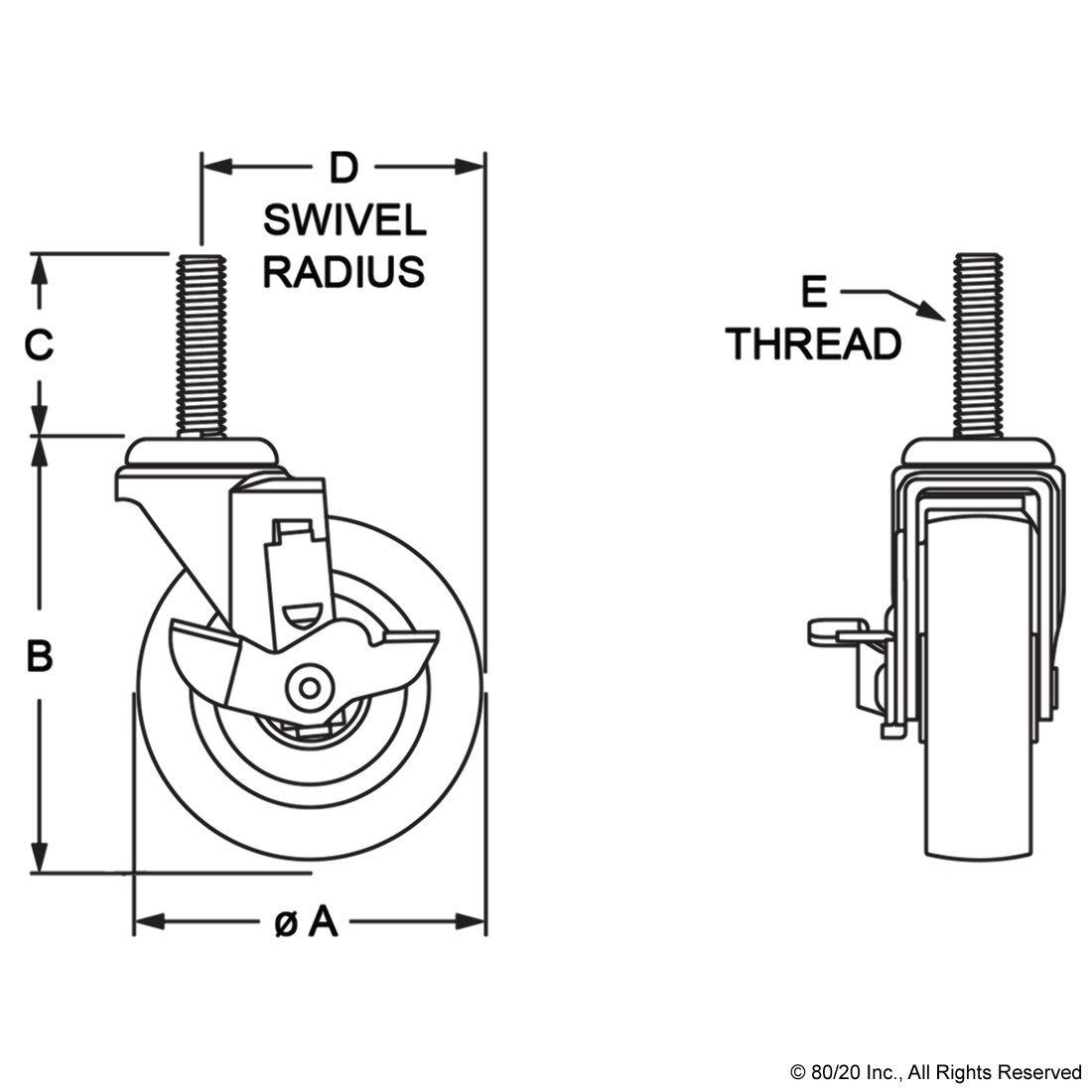 THE THREADED STEM SWIVEL CASTER IS A FOOT THAT ADDS MOBILITY TO AN APPLICATION AND CAN MOUNT DIRECTLY TO A T-SLOT PROFILE END, OR TO THE PROFILE SIDE USING A BASE PLATE. THERE ARE OPTIONS AVAILABLE WITH A SIDE OR FRONT MOUNT BRAKE KIT AS WELL AS VARIETIES WITHOUT A BRAKE. THE SWIVEL ENABLES EASY MOVEMENT AND PIVOT TURNS. IT IS OIL RESISTANT, MAKING IT IDEAL FOR USE IN INDUSTRIAL SETTINGS SUCH AS MOBILE CARTS AND WORKSTATIONS.