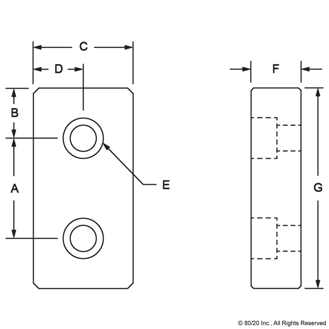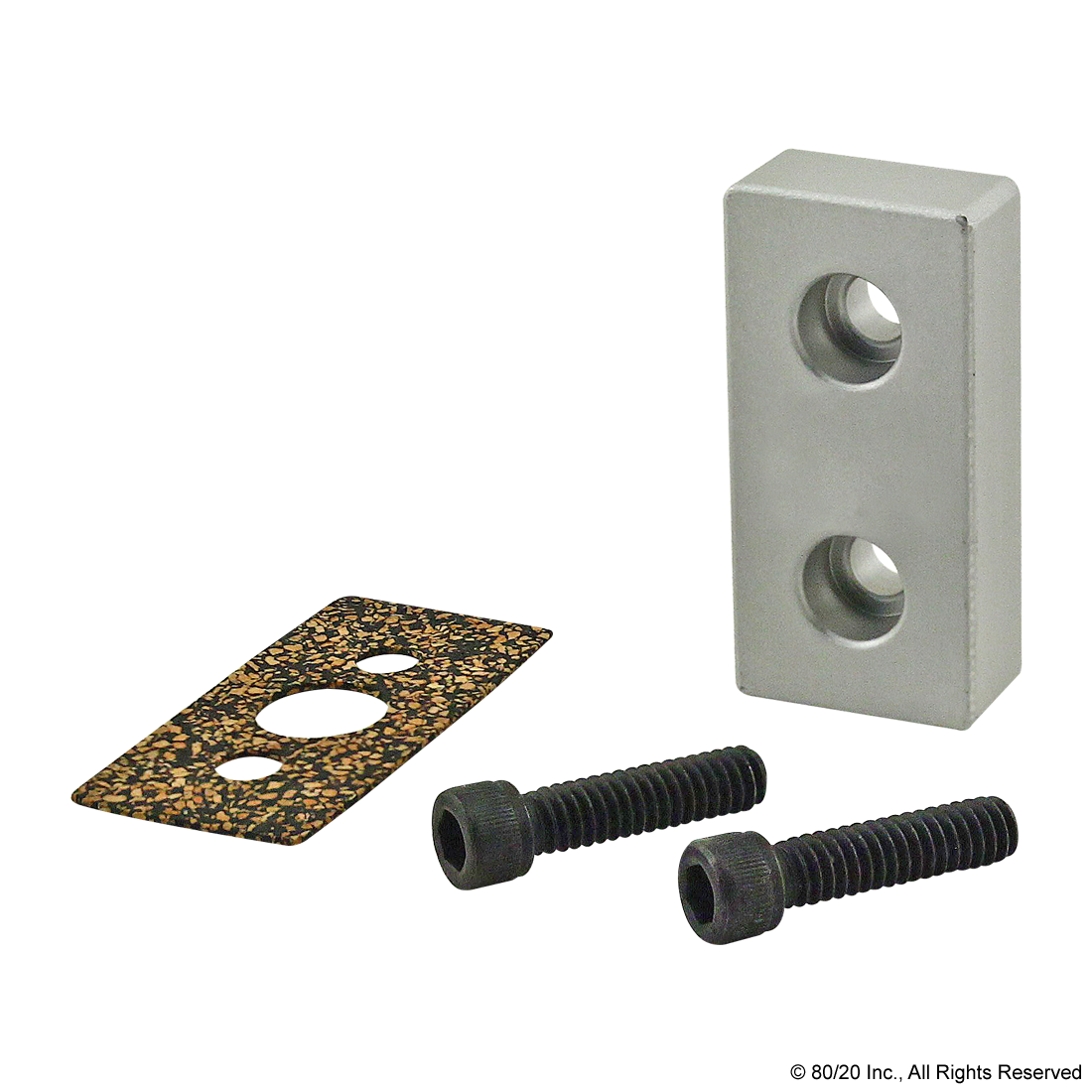 THE 2-HOLE PRESSURE MANIFOLD STOPPER PLATE IS COMMONLY USED WHEN ADDING A PRESSURIZED SUBSTANCE TO A T-SLOT PROFILE. IT MOUNTS ON THE PROFILE END TO FORM A SECURE SEAL. THE SUGGESTED MOUNTING HARDWARE AND GASKET ARE INCLUDED. THE MAXIMUM ALLOWABLE PRESSURE IS 150 PSI (1034.21 KPA).