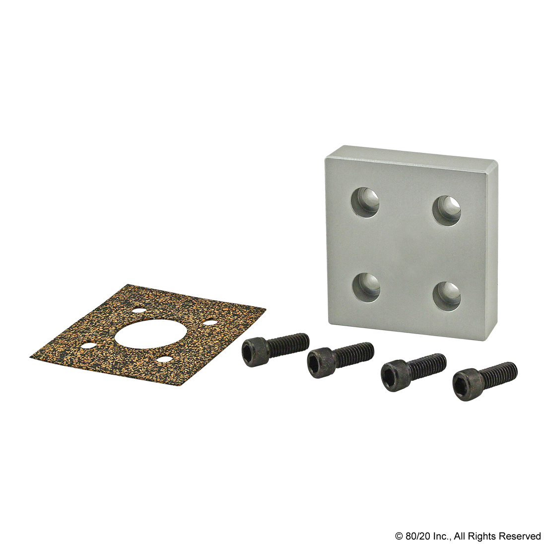 THE 4-HOLE PRESSURE MANIFOLD STOPPER PLATE IS COMMONLY USED WHEN ADDING A PRESSURIZED SUBSTANCE TO A T-SLOT PROFILE. IT MOUNTS ON THE PROFILE END TO FORM A SECURE SEAL. THE SUGGESTED MOUNTING HARDWARE AND GASKET ARE INCLUDED. THE MAXIMUM ALLOWABLE PRESSURE IS 150 PSI (1034.21 KPA).