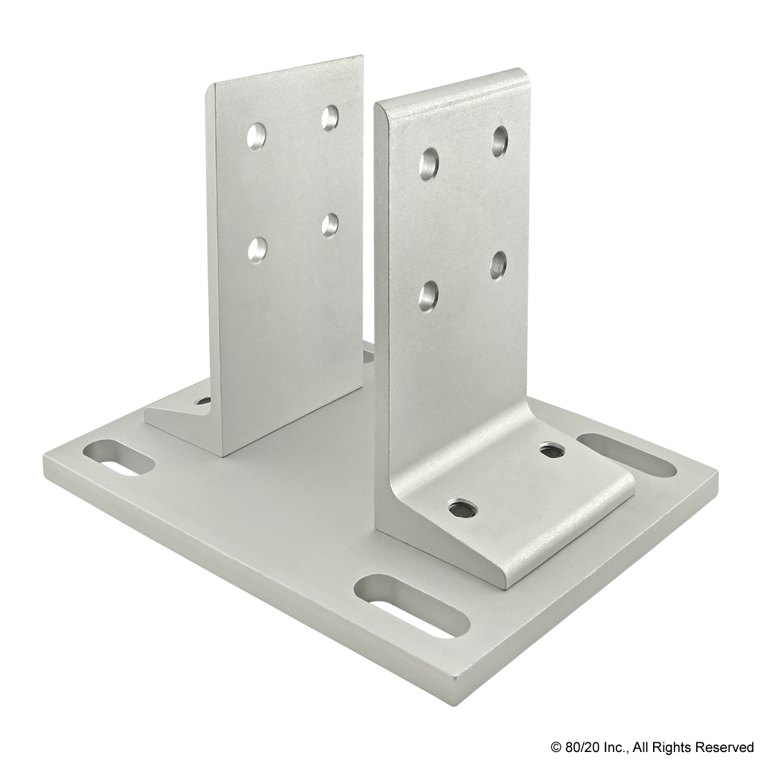 THE FLOOR MOUNT BASE PLATE IS MADE OF ANODIZED ALUMINUM TO WITHSTAND DAILY USE AND WEAR AND TEAR. IT HAS TWO UPRIGHT PLATES THAT SUPPORT THE SIDES OF THE PROFILE AND ENABLE VERTICAL ADJUSTMENTS. THE MOUNT ALSO HAS ANCHORING SLOTS TO BOLT THE FRAME TO THE FLOOR; THE SLOTS ALLOW LATERAL ADJUSTMENTS.
