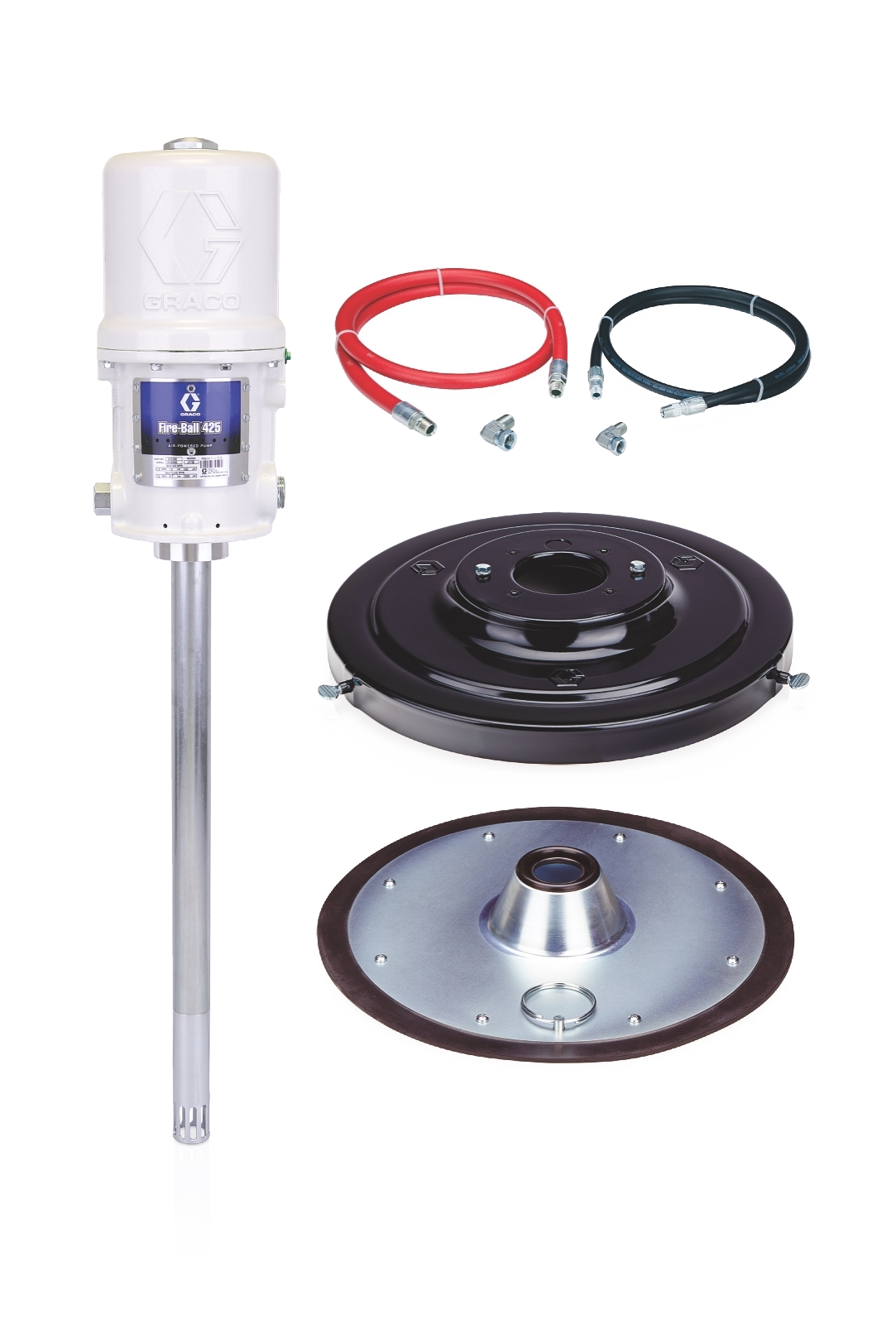 - Air inlet size (in): 0.5Air inlet thread gender: FemaleAir inlet thread type: NPTApplication: GreaseApplication text: The Fire-Ball 425 is the pump of choice for your most demanding high volume applications.Compatible material: GreaseDimension uom code: INDivision code: LEDFluid inlet type: SlottedFluid outlet size (cm): 0.9525Fluid outlet size (in): 3/8Fluid outlet size (mm): 9.525Fluid outlet thread gender: FemaleFluid outlet thread type: NPTIncludes: Fireball 425 50:1 Pump;Hose and Fitting Kit;Cover;Follow PlateMaximum air working pressure: 150Maximum working pressure (bar): 276Maximum working pressure (kpa): 27600Maximum working pressure (mpa): 27.6Maximum working pressure (psi): 4000Motor type: PneumaticPower type: PneumaticPump ratio: 50:1Pump weight (lb): 37Type: Piston Pump PackageWetted Material: CS;Leather