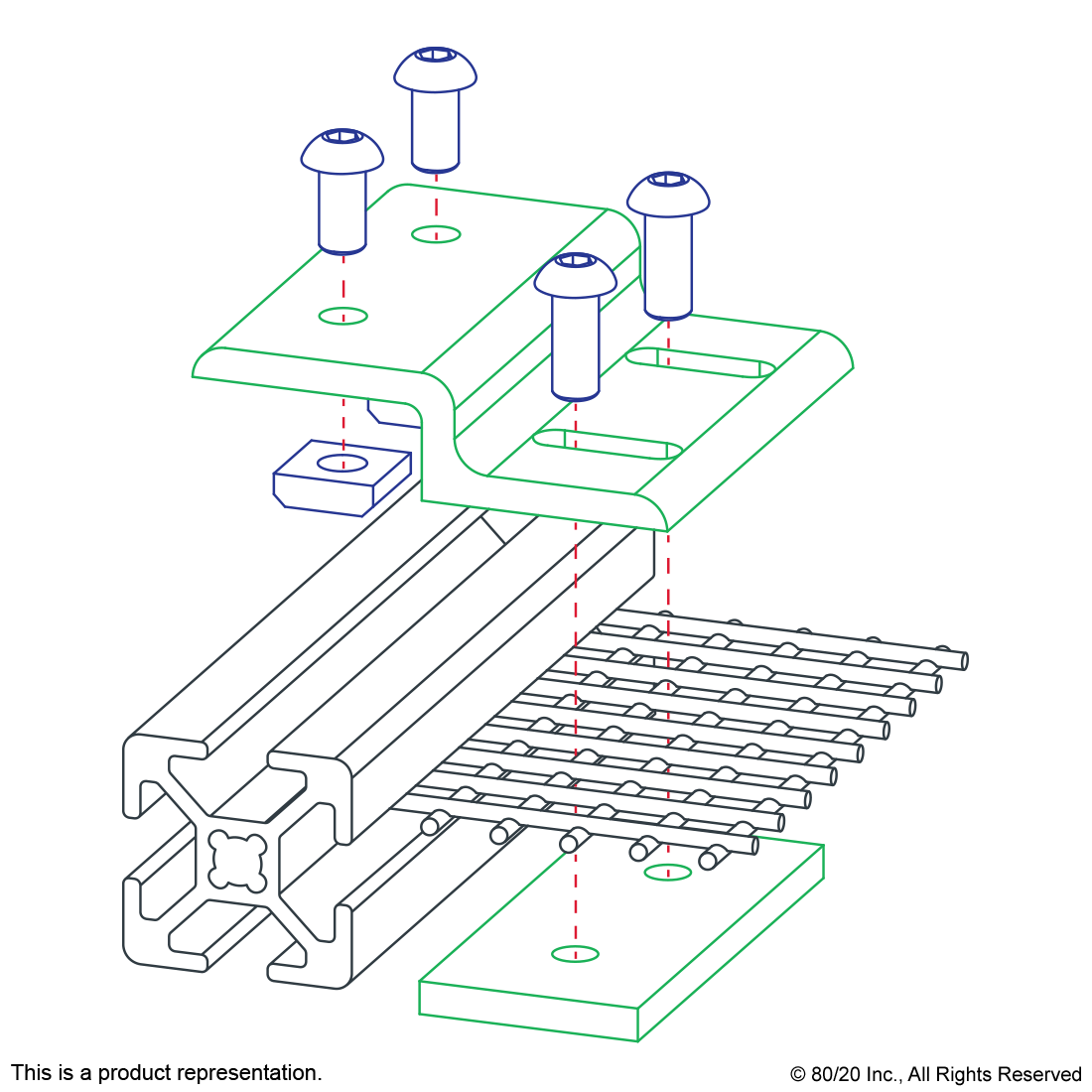 THE SINGLE ARM WIDE MESH RETAINER WITH WIDE BACKING PLATE CONSISTS OF ONE SINGLE ARM WIDE MESH RETAINER AND ONE WIDE BACKING PLATE. THE HARDWARE TO ATTACH THE BACKING PLATE TO THE RETAINER SHOULD BE SELECTED BASED ON THE WIRE MESH PANEL TYPE AND THICKNESS. THE SUGGESTED HARDWARE TO MOUNT THE RETAINER TO THE T-SLOT CAN BE FOUND ON THE "SUGGESTED HARDWARE" TAB.