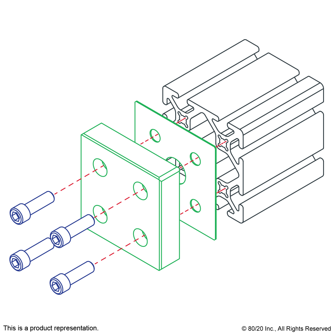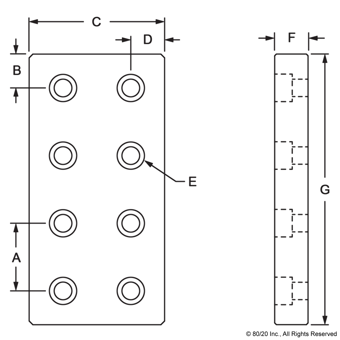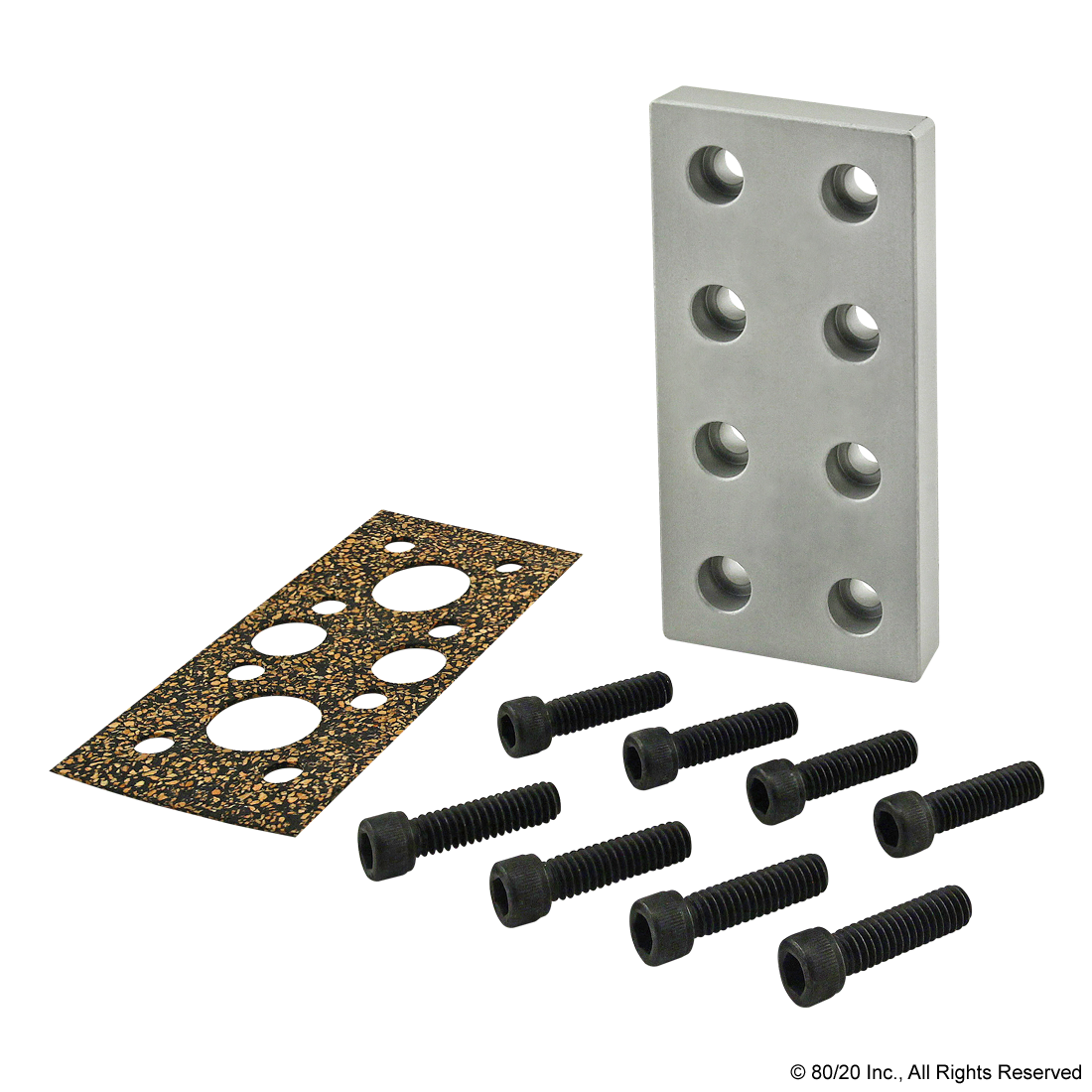 THE 8-HOLE PRESSURE MANIFOLD STOPPER PLATE IS COMMONLY USED WHEN ADDING A PRESSURIZED SUBSTANCE TO A T-SLOT PROFILE. IT MOUNTS ON THE PROFILE END TO FORM A SECURE SEAL. THE SUGGESTED MOUNTING HARDWARE AND A GASKET ARE INCLUDED. THE MAXIMUM ALLOWABLE PRESSURE IS 150 PSI (1034.21 KPA).