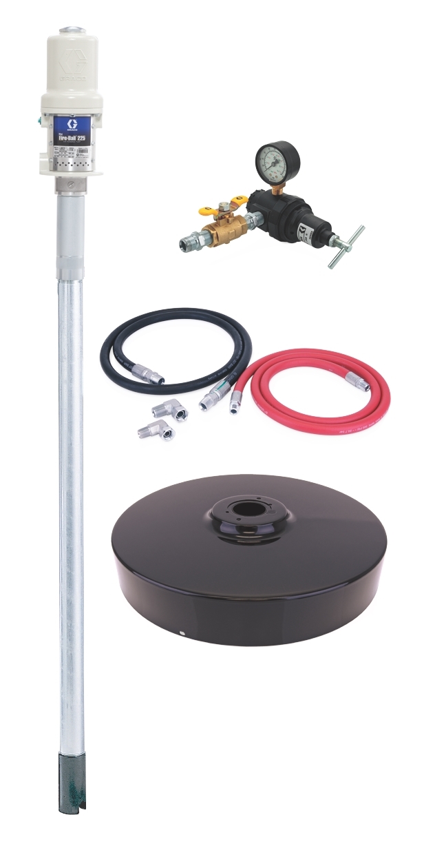 - Air inlet size (cm): 0.9525Air inlet size (in): 3/8Air inlet size (mm): 9.525Air inlet thread gender: FemaleAir inlet thread type: NPTAir motor effective diameter (in): 2.25Application: IndustrialApplication text: The Mini Fire-Ball 225 3:1 is perfect for medium pressure, low volume oil applications.Compatible material: OilCycles per gallon: 43.5Dimension uom code: INDivision code: LEDFluid inlet size (cm): 3.81Fluid inlet size (in): 1-1/2Fluid inlet size (mm): 38.1Fluid inlet thread gender: FemaleFluid inlet thread type: NPTFluid outlet size (cm): 1.27Fluid outlet size (in): 1/2Fluid outlet size (mm): 12.7Fluid outlet thread gender: FemaleFluid outlet thread type: NPTFor use with: Petroleum- and synthetic-based oils (motor, gear and ATF)Includes: Hose Installation Kit;Drum Cover;Air RegulatorMaximum air consumption (scfm): 20Maximum air inlet pressure (bar): 12.41Maximum air inlet pressure (kpa): 1241Maximum air inlet pressure (psi): 180Maximum continuous cycle rate (cpm): 100Maximum working pressure (bar): 37Maximum working pressure (kpa): 3700Maximum working pressure (mpa): 3.7Maximum working pressure (psi): 540Power type: PneumaticPump ratio: 3:1Sound power level (db(a)): 85.6Sound pressure level (db(a)): 77.8Type: Pneumatic Piston PumpWeight (kg): 0.7264Weight (lb): 16Wetted Material: Steel;Polyurethane;Aluminum;Buna-N