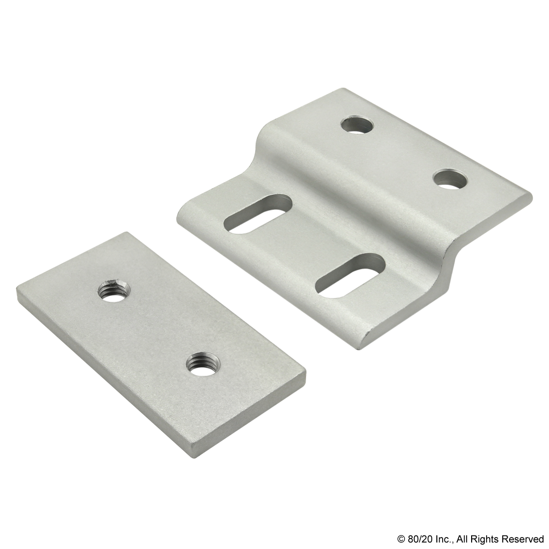 THE SINGLE ARM WIDE MESH RETAINER WITH WIDE BACKING PLATE CONSISTS OF ONE SINGLE ARM WIDE MESH RETAINER AND ONE WIDE BACKING PLATE. THE HARDWARE TO ATTACH THE BACKING PLATE TO THE RETAINER SHOULD BE SELECTED BASED ON THE WIRE MESH PANEL TYPE AND THICKNESS. THE SUGGESTED HARDWARE TO MOUNT THE RETAINER TO THE T-SLOT CAN BE FOUND ON THE "SUGGESTED HARDWARE" TAB.