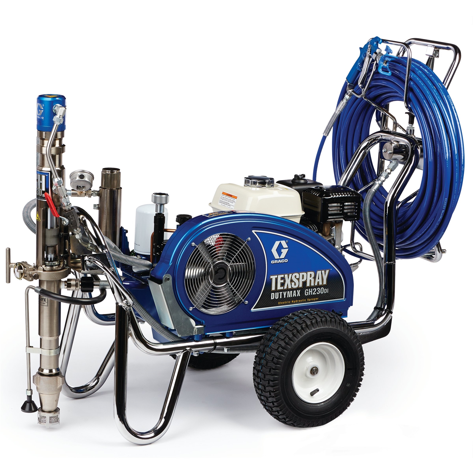 - Compatible electric motor kits:Â 248949;248950 (CSA)Compatible material:Â Acrylics;Coating;Drywall Mud;Elastomer;Enamel;Epoxies;LatexConvertible:Â YesDimension uom code:Â INDivision code:Â CEDEngine brand:Â HondaEngine size (hp):Â 6.5Engine size (kw):Â 4.8Features:Â Extreme-Duty MaxLife Pump;MaxFlo 2;High-Capacity Cooling System;Honda Engine;ProConnect 2;QuikReel;Crushproof Inlet Strainer;Convertible;Easy Out Filter;Heavy-Duty Prime Valve;Durable Cart DesignFluid inlet size (cm):Â 3.33Fluid inlet size (in):Â 1-5/16Fluid inlet thread type:Â UN-2AFluid outlet size (cm):Â 0.375Fluid outlet size (in):Â 3/8Fluid outlet thread type:Â NPTFrame configuration:Â CartHose inlet diameter (cm):Â 0.95Hose inlet diameter (in):Â 3/8Hose reel type:Â QuikReelIncludes:Â Heavy-Duty Blue Texture Gun;RAC X LTX 427 Spray Tip;RAC X LTX 531 Spray Tip;RAC X Guard;3/8 in x 100 ft BlueMax II Airless Hose;1/4 in x 3 ft BlueMax II Airless Whip Hose;TSL 4 ozMaterial application:Â Paints;PrimersMaximum flow rate (gpm):Â 2.35Maximum flow rate (l/min):Â 8.9Maximum hose length (ft):Â 100Maximum hose length (m):Â 30Maximum sound pressure level (db(a)):Â 96Maximum tip size (cm):Â 0.1346Maximum tip size (in):Â 0.053Maximum tip size (mm):Â 1.3462Maximum tip size gun 1 (cm):Â 0.1346Maximum tip size gun 1 (in):Â 0.053Maximum tip size gun 1 (mm):Â 1.3462Maximum working pressure (bar):Â 227Maximum working pressure (kpa):Â 2270Maximum working pressure (psi):Â 3300Number of guns:Â 1Outlet paint filter:Â 60 Mesh Stainless Steel ScreenOverall height (cm):Â 99Overall height (in):Â 39Overall height (mm):Â 990.6000Overall length (cm):Â 132Overall length (in):Â 52Overall length (mm):Â 1320.8Overall width (cm):Â 67Overall width (in):Â 26.5Overall width (mm):Â 673.1000Power rating (cc):Â 200Power rating (hp):Â 6.5Power rating (kw):Â 4.8Power source:Â Gas HydraulicPump mount type:Â ProConnect 2Pump rod type:Â Hard ChromePump sleeve material:Â MaxLifePump type:Â EnduranceRecommended annual usage:Â 100-200 gallons per weekType:Â Airless SprayerVolume per cycle (cycles/gal):Â 80Weight (kg):Â 90Weight (lb):Â 199Wetted Material:Â Acetal;Aluminum;Ceramics;Chrome Plating;Leather;Nylon;PTFE;Stainless Steel;Tungsten Carbide;UHMWPE;Zinc-Plated Carbon Steel;Nickel-Plated Carbon Steel