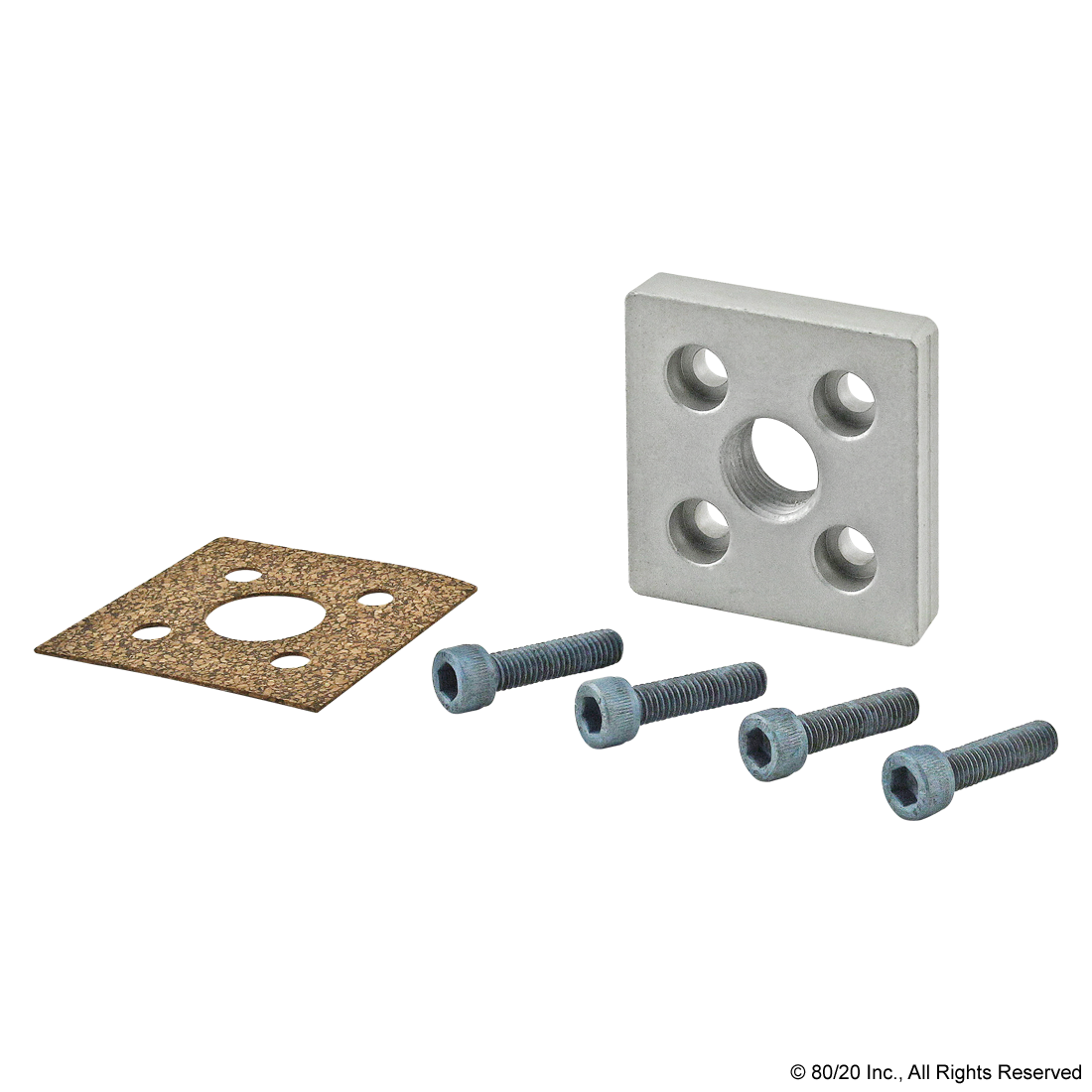 THE 5-HOLE SQUARE PRESSURE MANIFOLD FEED PLATE IS COMMONLY USED WHEN ADDING A PRESSURIZED SUBSTANCE TO A T-SLOT PROFILE. IT HAS A TAPPED HOLE AND MOUNTS ON THE PROFILE END TO SEAL THE CONNECTION WHERE THE PRESSURIZED SUBSTANCE IS RELEASED. THE SUGGESTED MOUNTING HARDWARE AND GASKET ARE INCLUDED. THE MAXIMUM ALLOWABLE PRESSURE IS 150 PSI (1034.21 KPA).