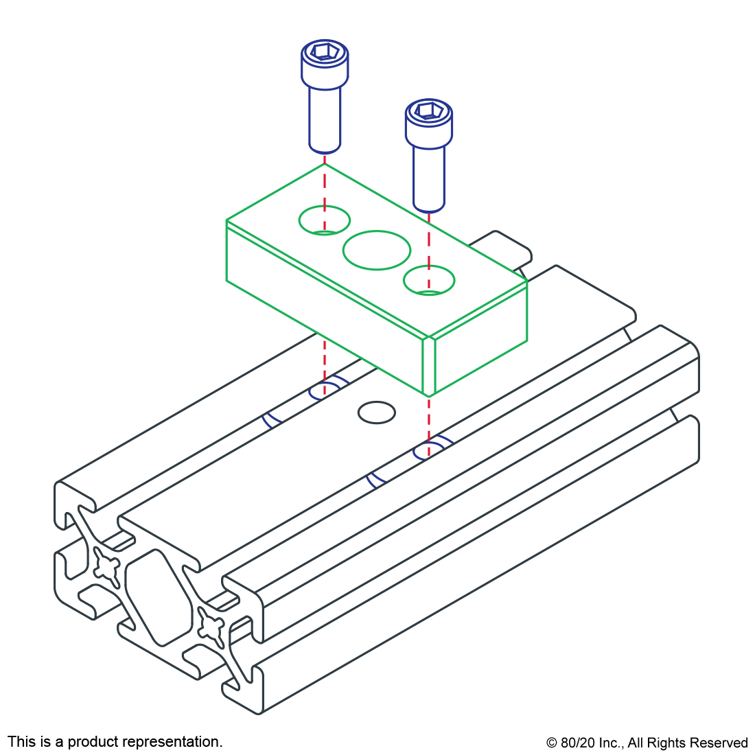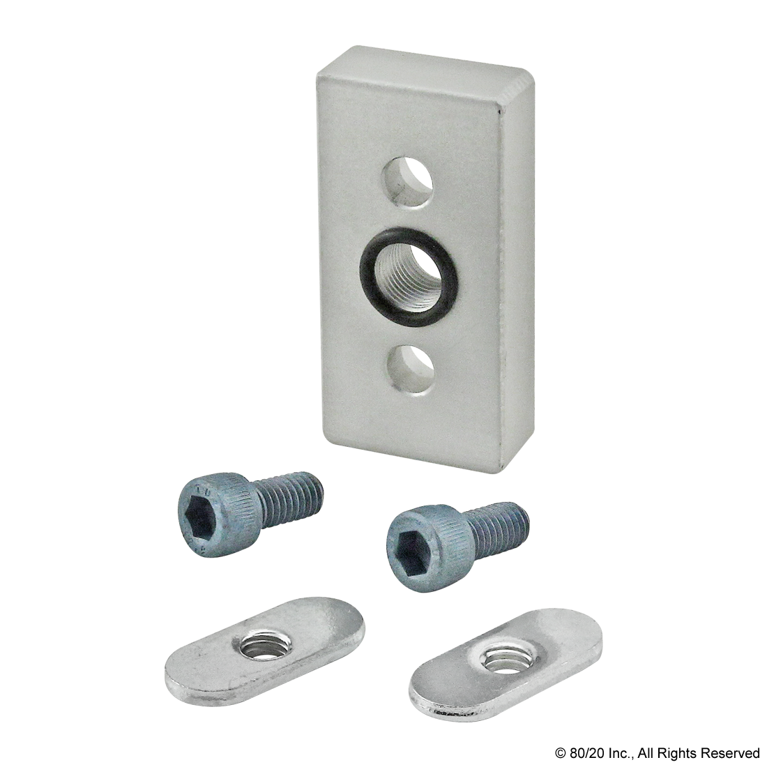 THE PRESSURE MANIFOLD ACCESS PLATE IS COMMONLY USED WHEN ADDING A PRESSURIZED SUBSTANCE TO A T-SLOT PROFILE. IT HAS A TAPPED HOLE, MOUNTS TO THE PROFILE SIDE, AND INCLUDES AN ATTACHED O-RING TO PROVIDE A TIGHT SEAL WHERE THE PRESSURIZED SUBSTANCE IS RELEASED. THE MAXIMUM ALLOWABLE PRESSURE IS 150 PSI (1034.21 KPA). THE SUGGESTED MOUNTING HARDWARE IS INCLUDED.