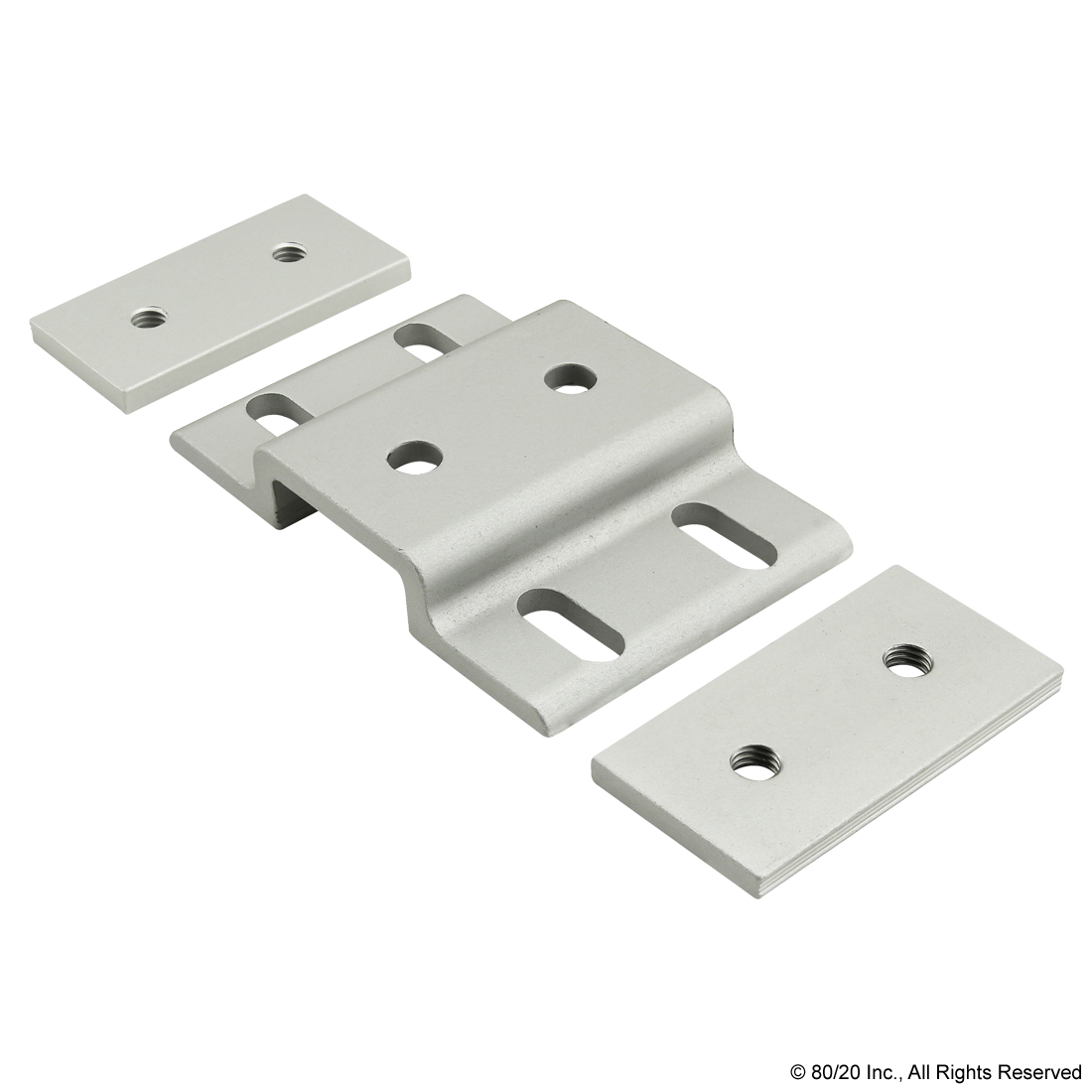 THE DOUBLE ARM WIDE MESH RETAINER WITH WIDE BACKING PLATES CONSISTS OF ONE DOUBLE ARM WIDE MESH RETAINER AND TWO WIDE BACKING PLATES. THE HARDWARE TO ATTACH THE BACKING PLATES TO THE RETAINER SHOULD BE SELECTED BASED ON THE WIRE MESH PANEL TYPE AND THICKNESS. THE SUGGESTED HARDWARE TO MOUNT THE RETAINER TO THE T-SLOT CAN BE FOUND ON THE "SUGGESTED HARDWARE" TAB.