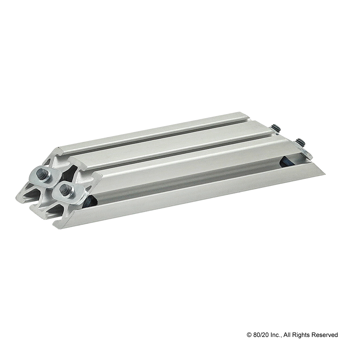 THE 45 DEGREE SUPPORT ASSEMBLY INCLUDES SOCKET HEAD CAP SCREWS, WASHERS AND T-NUTS. THE SUPPORT ASSEMBLY IS PRE-MACHINED WITH COUNTERBORES AND A 45 DEGREE MITER ANGLE ON BOTH ENDS. THIS FASTENING METHOD PROVIDES A CLEAN, FLUSH CONNECTION AND IS TYPICALLY USED TO REINFORCE A 90 DEGREE CONNECTION. THIS CONNECTION LENDS ITSELF TO APPLICATIONS WITH HEAVY LOADS TO MINIMIZE BEAM DEFLECTION.