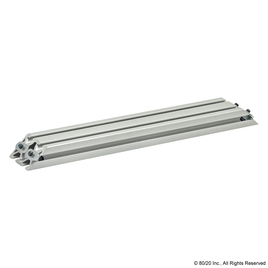 THE 45 DEGREE SUPPORT ASSEMBLY INCLUDES SOCKET HEAD CAP SCREWS, WASHERS AND T-NUTS. THE SUPPORT ASSEMBLY IS PRE-MACHINED WITH COUNTERBORES AND A 45 DEGREE MITER ANGLE ON BOTH ENDS. THIS FASTENING METHOD PROVIDES A CLEAN, FLUSH CONNECTION AND IS TYPICALLY USED TO REINFORCE A 90 DEGREE CONNECTION. THIS CONNECTION LENDS ITSELF TO APPLICATIONS WITH HEAVY LOADS TO MINIMIZE BEAM DEFLECTION.