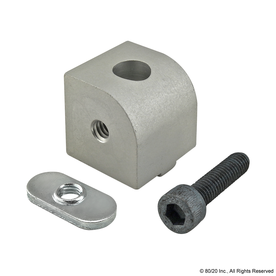 THE 0 DEGREE DYNAMIC RIGHT ANGLE PIVOT NUB IS COMMONLY USED AS A CONNECTION HUB FOR DYNAMIC PIVOTS TO CREATE AXIAL MOTION RANGING FROM 0-90 DEGREES PARALLEL TO THE MOUNTING PROFILE. THIS PIVOT NUB REQUIRES NO MACHINING SERVICES AND CAN BE EASILY ASSEMBLED, LENDING ITSELF TO REPOSITIONING AND REUSE. THE HARDWARE TO MOUNT THE NUB TO A PROFILE IS INCLUDED. THE SUGGESTED MOUNTING HARDWARE TO ATTACH THE ARM TO THE NUB CAN BE FOUND ON THE "SUGGESTED HARDWARE" TAB.,