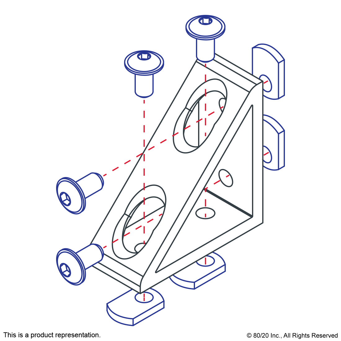 THE 4 HOLE - TALL GUSSETED INSIDE CORNER BRACKET IS A STRONG, EXTERNAL FASTENING METHOD THAT CREATES A 90 DEGREE CONNECTION. EACH SIDE OF THE BRACKET HAS TWO HOLES STACKED ONE ON TOP OF THE OTHER. IT REQUIRES NO MACHINING SERVICES AND CAN PROVIDE INFINITE POSITIONING ALONG THE PROFILE T-SLOT, ALLOWING A LARGE DEGREE OF ADJUSTABILITY. THE SHAPE OF THE GUSSET PROVIDES EXTRA MATERIAL, STRENGTHENING THE CONNECTION. THE 4 HOLE - TALL GUSSETED INSIDE CORNER BRACKET ENGAGES THE 2-DEGREE DROP-LOCK FEATURE WHEN THE ASSEMBLY BOLTS ARE TIGHTENED TO THE REQUIRED TORQUE. IT IS A FASTENING METHOD THAT CAN BE REPOSITIONED AND REUSED. THE SUGGESTED MOUNTING HARDWARE CAN BE FOUND ON THE "SUGGESTED HARDWARE" TAB. ,