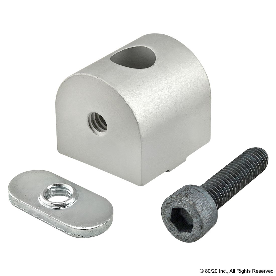 THE 0 DEGREE STRUCTURAL PIVOT NUB IS AN EXTERNAL FASTENING METHOD COMMONLY USED AS A CONNECTION HUB TO CREATE A STRUCTURAL PIVOT RANGING FROM 0-180 DEGREES PARALLEL TO THE MOUNTING PROFILE. IT HAS A SLOT TAB THAT HELPS PREVENT THE NUB FROM ROTATING AS WELL AS ASSISTS WITH ALIGNMENT IN THE T-SLOT. THE 0 DEGREE STRUCTURAL PIVOT NUB REQUIRES NO MACHINING SERVICES AND CAN BE EASILY ASSEMBLED, LENDING ITSELF TO REPOSITIONING AND REUSE. THE SUGGESTED MOUNTING HARDWARE CAN BE FOUND ON THE "SUGGESTED HARDWARE" TAB. ,