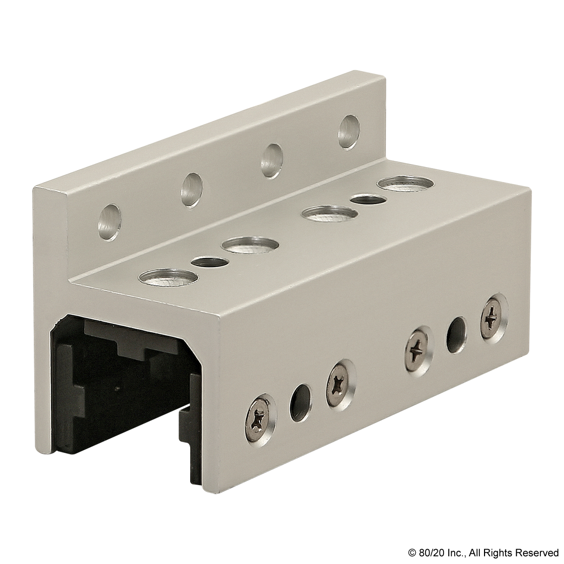 THE 3-MOUNT - SINGLE FLANGE LONG STANDARD LINEAR BEARING WITH BRAKE HOLES IS TYPICALLY USED IN LINEAR MOTION APPLICATIONS. IT HOUSES PROFILES WITH A MINIMUM OF THREE OPEN T-SLOTS, HAS A SINGLE FLANGE AND IS A LONGER OPTION. THE BEARING INCLUDES PADS, SCREWS AND SHIMS; THE PADS ARE MADE OF SELF-LUBRICATING UHMW. ALL 80/20 BEARINGS ARE DESIGNED FOR COMPRESSION LOADS ONLY AND NOT INTENDED TO SUPPORT HANGING LOADS.