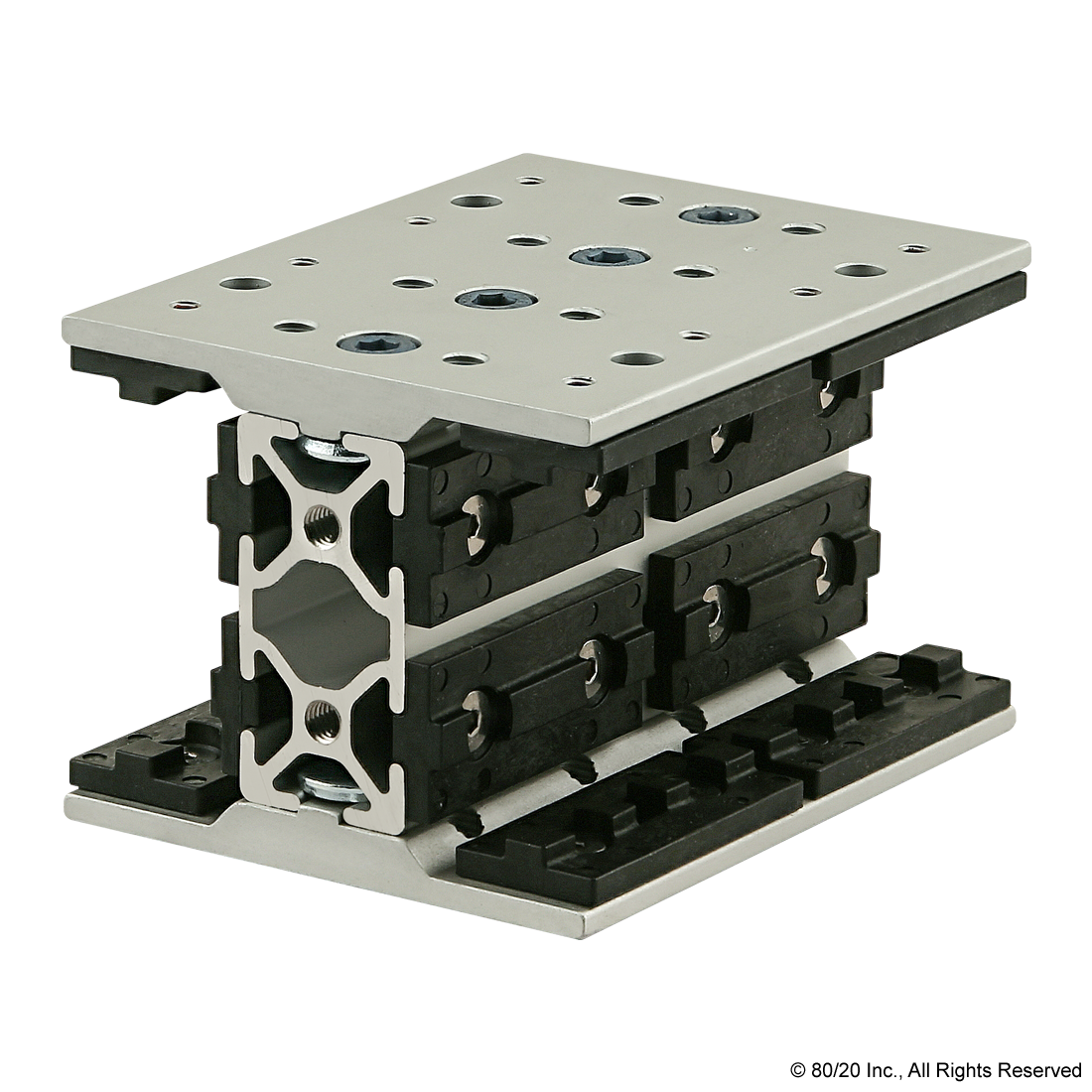 THE LONG - DOUBLE MOUNT UNIBEARING™ ASSEMBLY IS COMMONLY USED FOR LINEAR MOTION APPLICATIONS AND IS COMPRISED OF A LONG DOUBLE MOUNT UNIBEARING™ THAT IS ATTACHED TO A T-SLOT PROFILE. THERE ARE PRE-TAPPED HOLES IN THE PROFILE ENDS AS WELL AS IN THE HOUSING UNIT FOR CONNECTING ACCESSORIES. SHIM KITS ARE INCLUDED.