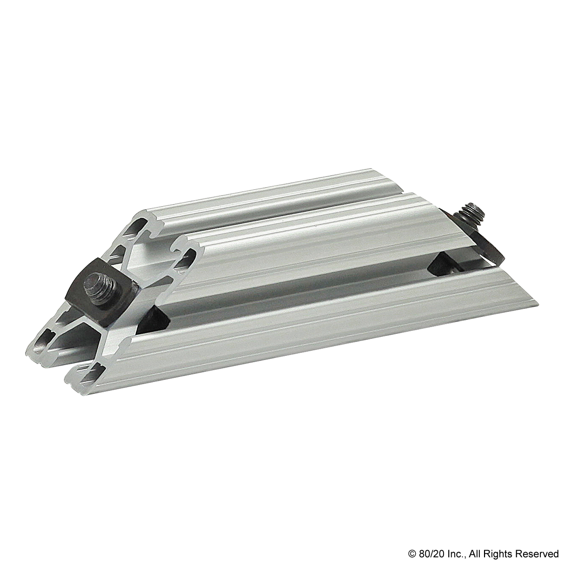 THE 45 DEGREE SUPPORT ASSEMBLY INCLUDES SOCKET HEAD CAP SCREWS, WASHERS AND T-NUTS. THE SUPPORT ASSEMBLY IS PRE-MACHINED WITH COUNTERBORES AND A 45 DEGREE MITER ANGLE ON BOTH ENDS. THIS FASTENING METHOD PROVIDES A CLEAN, FLUSH CONNECTION AND IS TYPICALLY USED TO REINFORCE A 90 DEGREE CONNECTION. THIS CONNECTION LENDS ITSELF TO APPLICATIONS WITH HEAVY LOADS TO MINIMIZE BEAM DEFLECTION.