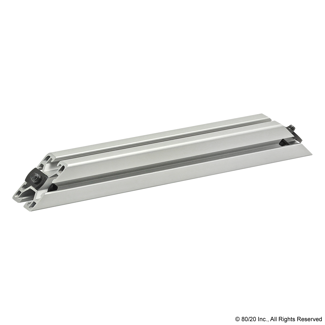 THE 45 DEGREE SUPPORT ASSEMBLY INCLUDES SOCKET HEAD CAP SCREWS, WASHERS AND T-NUTS. THE SUPPORT ASSEMBLY IS PRE-MACHINED WITH COUNTERBORES AND A 45 DEGREE MITER ANGLE ON BOTH ENDS. THIS FASTENING METHOD PROVIDES A CLEAN, FLUSH CONNECTION AND IS TYPICALLY USED TO REINFORCE A 90 DEGREE CONNECTION. THIS CONNECTION LENDS ITSELF TO APPLICATIONS WITH HEAVY LOADS TO MINIMIZE BEAM DEFLECTION.